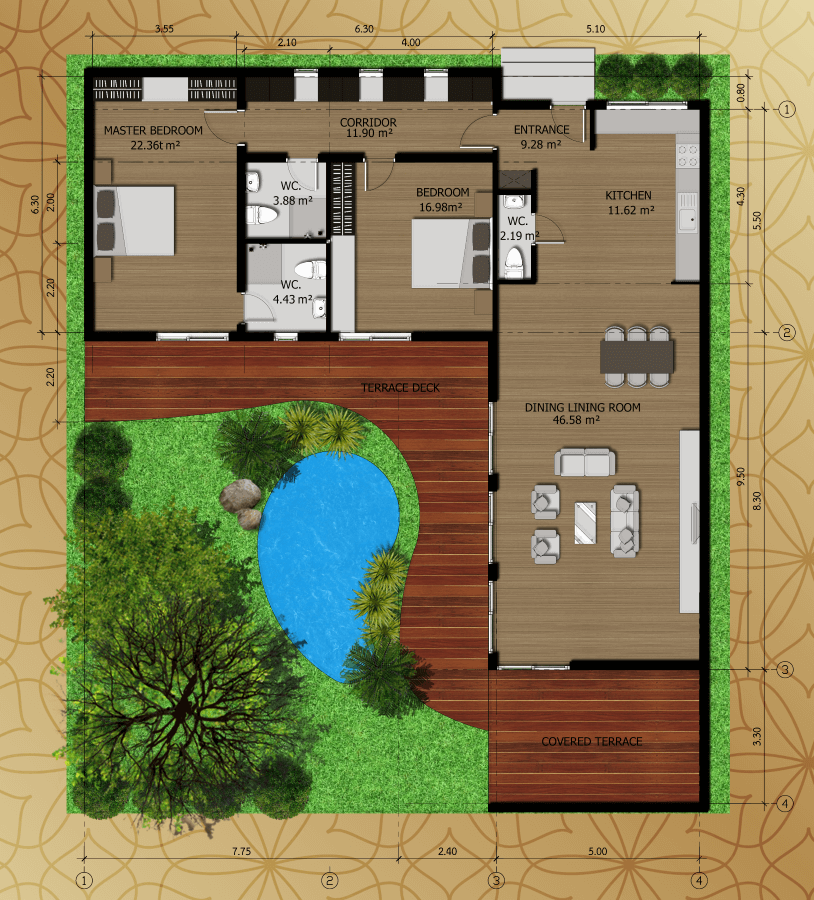 Villas consisting of 120 square meter living area, with spacious living room, two or three bedrooms, two bathrooms with shower cubicle, inbuilt European style kitchen, guest toilet, huge terrace with deck chairs and table facing the landscaped garden with a small artificial pond and plenty of flowers and small plants; fully furnished including beds, cabinets, sofa, TV, telephone, Internet, tables and chairs.