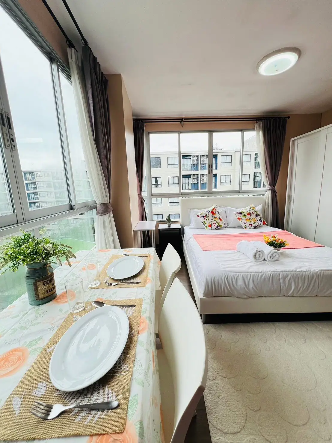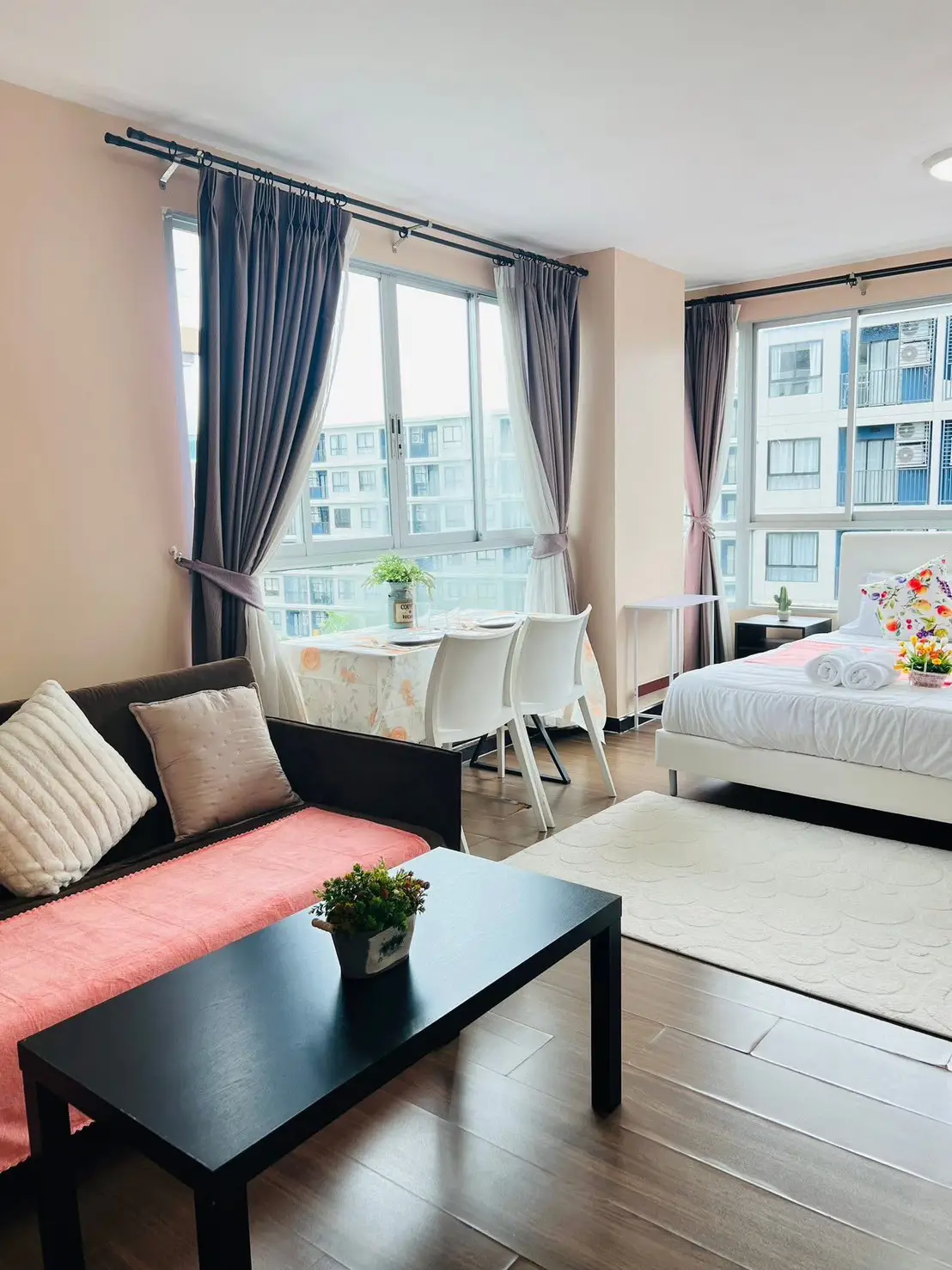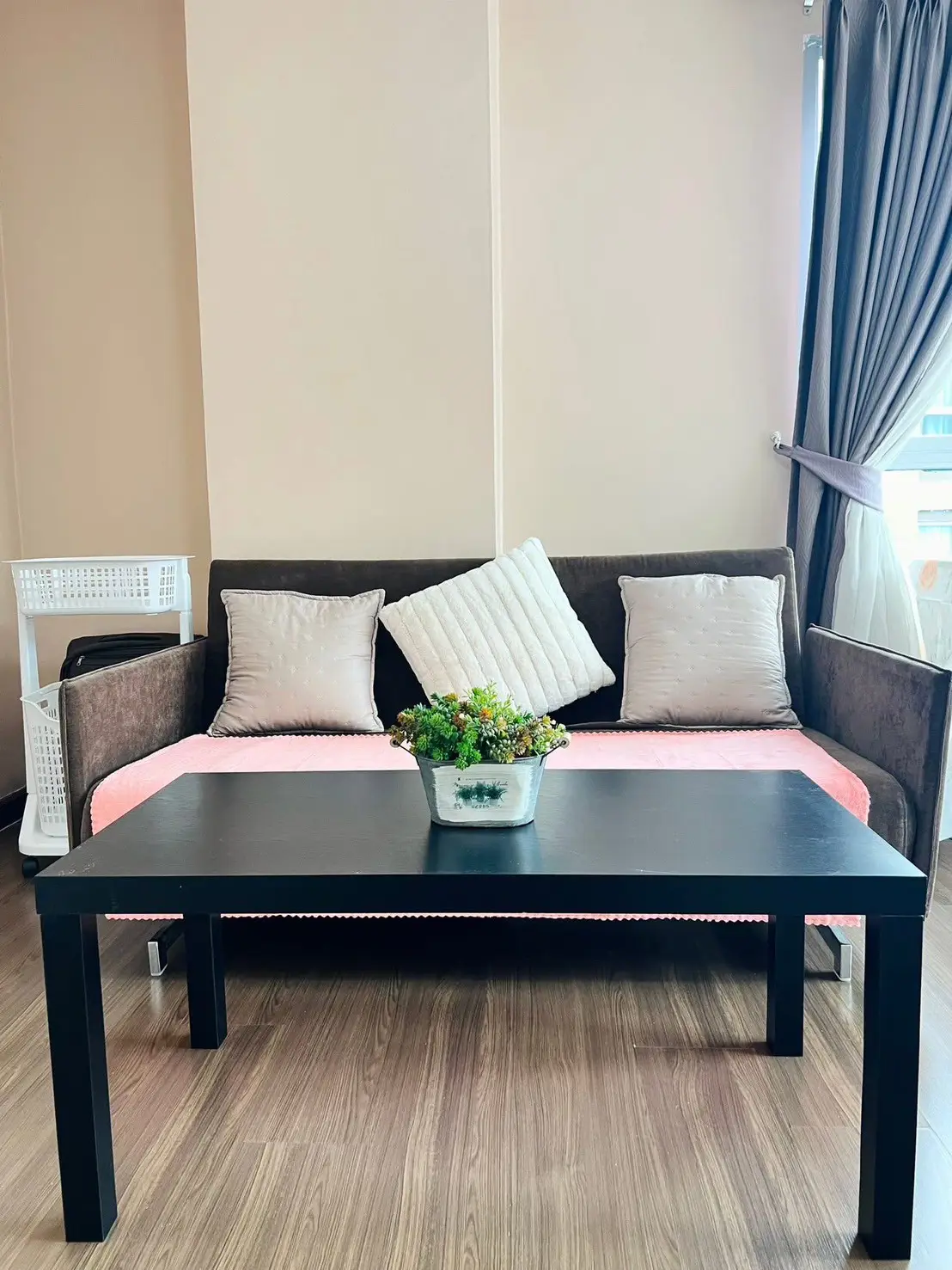 The property comes fully equipped with modern furniture and appliances, including refrigerator, free TV, microwave, washing machine, and decorative items from Index. The room is ready to move in immediately.