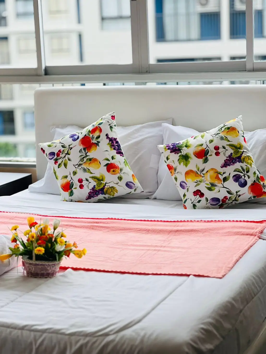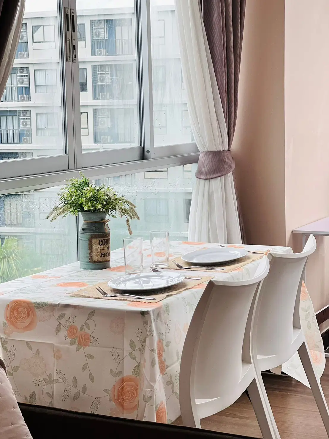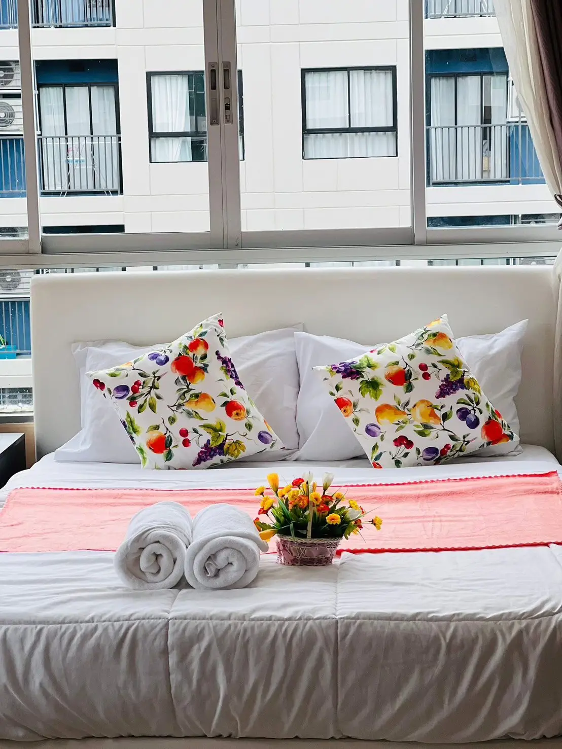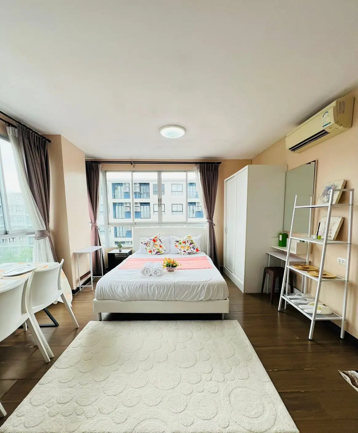 The property comes fully equipped with modern furniture and appliances, including refrigerator, free TV, microwave, washing machine, and decorative items from Index. The room is ready to move in immediately.
