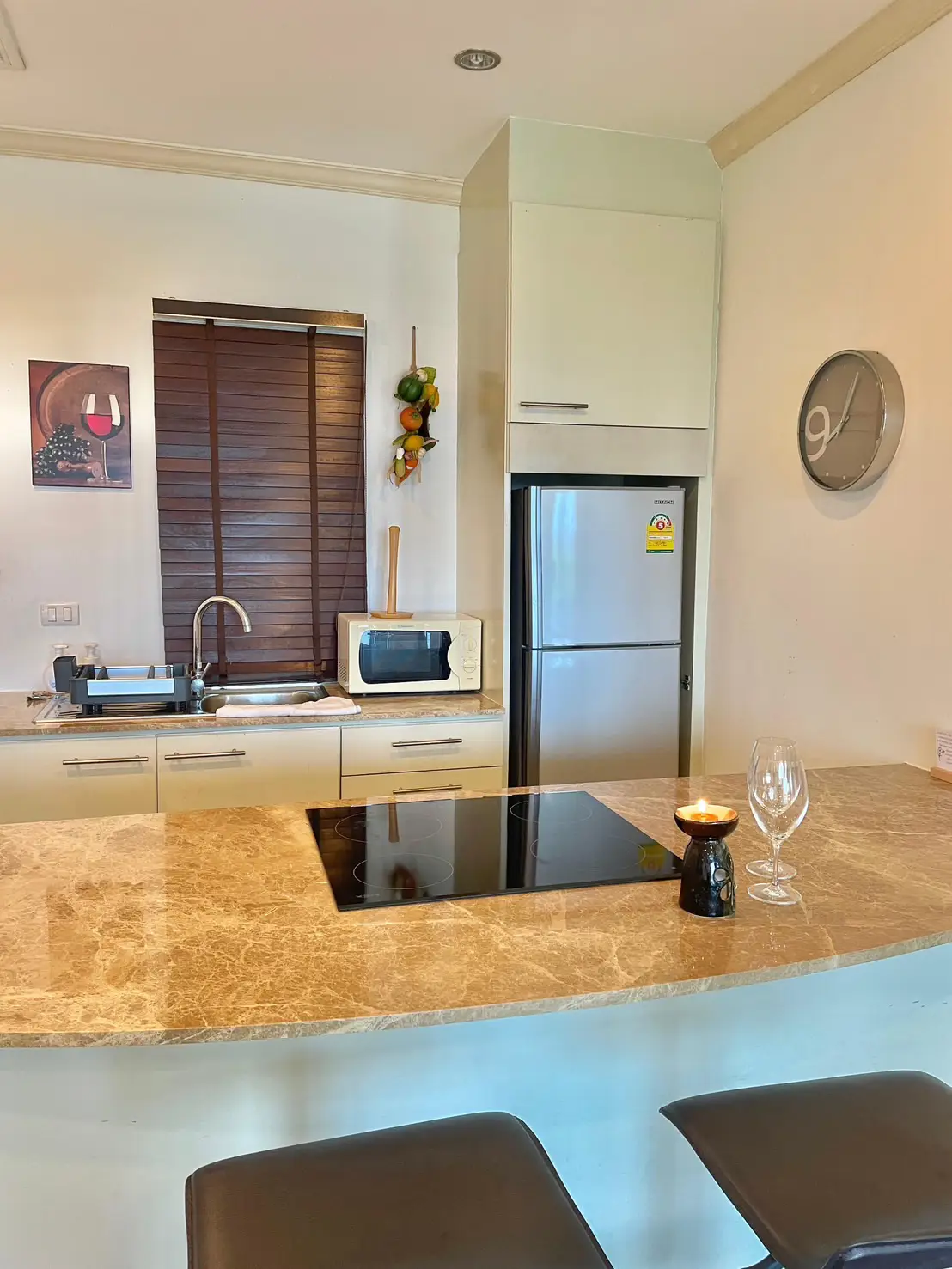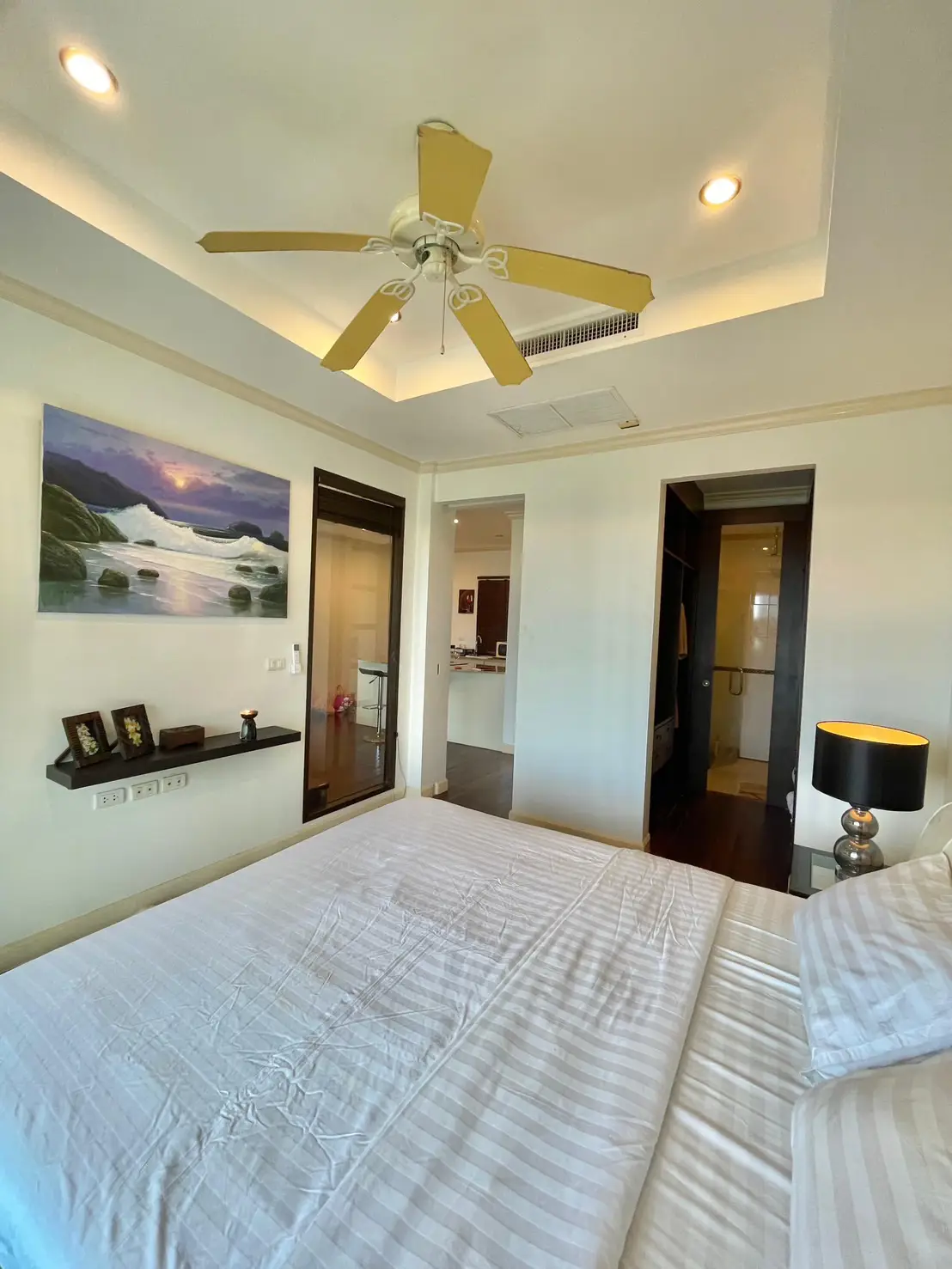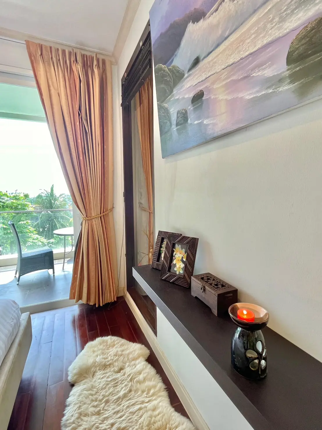 The condo comes fully furnished with marble countertops and hardwood flooring for a touch of luxury. Located just 900 meters from Phuket Smart Bus on Patak Road, it offers both tranquility and convenience.