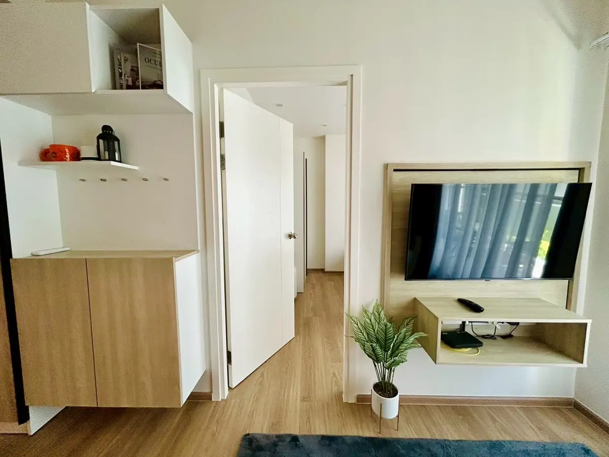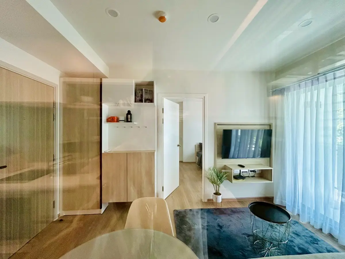 This fully furnished 1-bedroom condo is located on the 2nd floor of Building B at The Phyll Phuket. The unit offers 33 sq.m. of living space, featuring a balcony facing the construction site of a new project, a living area, kitchenette, and private bathroom.