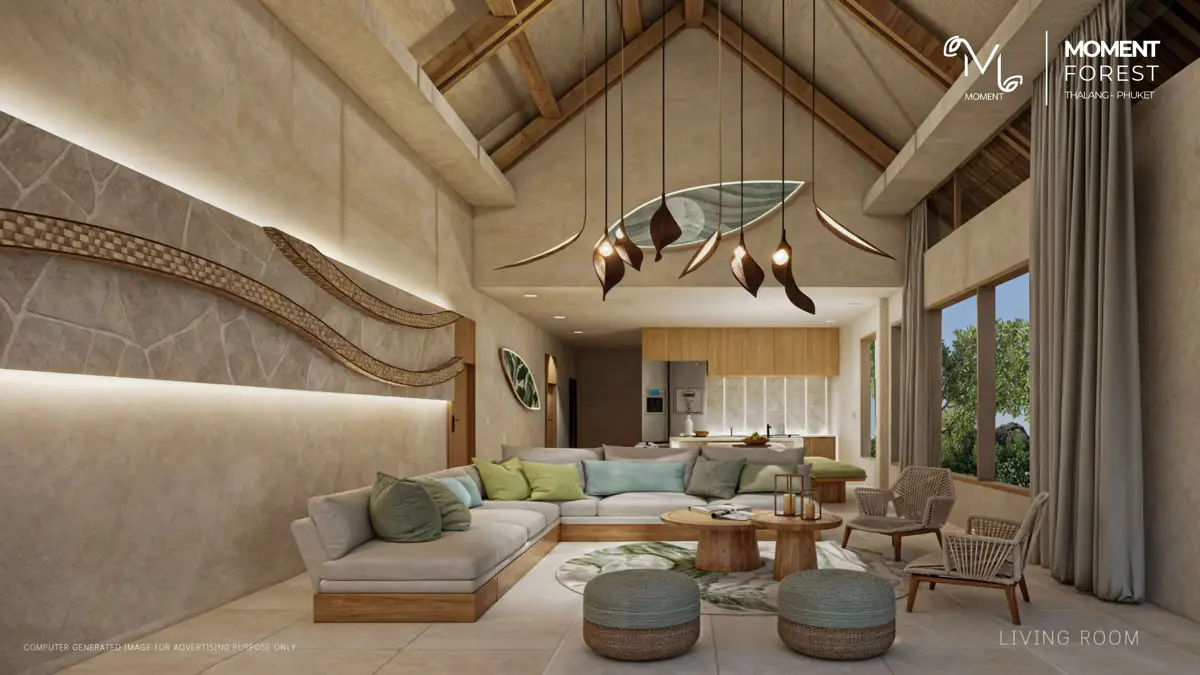Embrace tropical living in this beautifully designed 2-bedroom, 3-bathroom villa at The Moment Forest. Situated on a 512 sq.m. land plot with a 406 sq.m. built-up area, the villa features open-concept living and dining areas that blend seamlessly with the fully equipped European Kitchen. Expansive glass doors open directly onto a private swimming pool and lush landscaped garden, offering the perfect balance between indoor comfort and outdoor relaxation. Ideal for couples or small families looking for a tranquil lifestyle in a natural tropical setting.