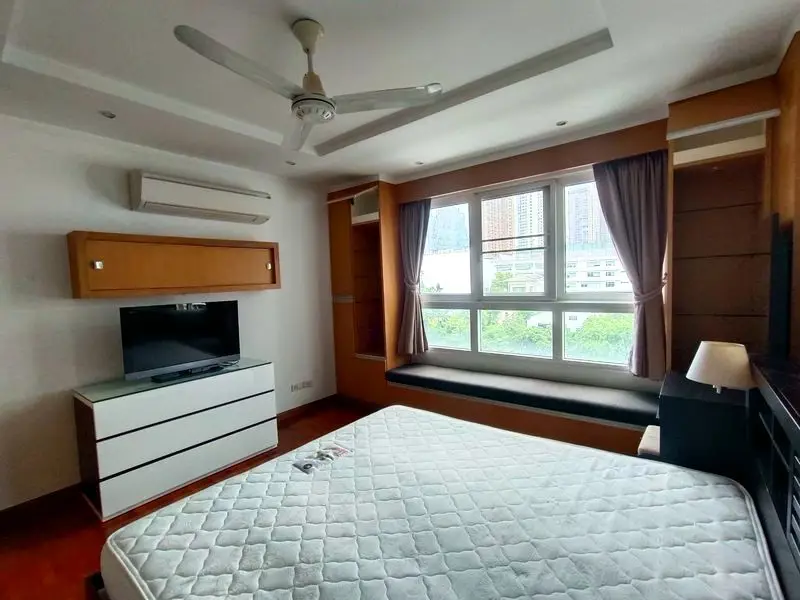 There is a dining area large enough to comfortably seat six people and then a pleasant sitting area adjacent to the sliding doors that lead on to the balcony. The living area has a Daikin inverter system air-conditioning unit which greatly reduces power consumption. Moving into the spacious and well decorated master bedroom you will find a pleasant seating area below the East facing window, king size bed and plenty of well-designed storage space. Its en-suite bathroom has a sink, toilet and large shower.