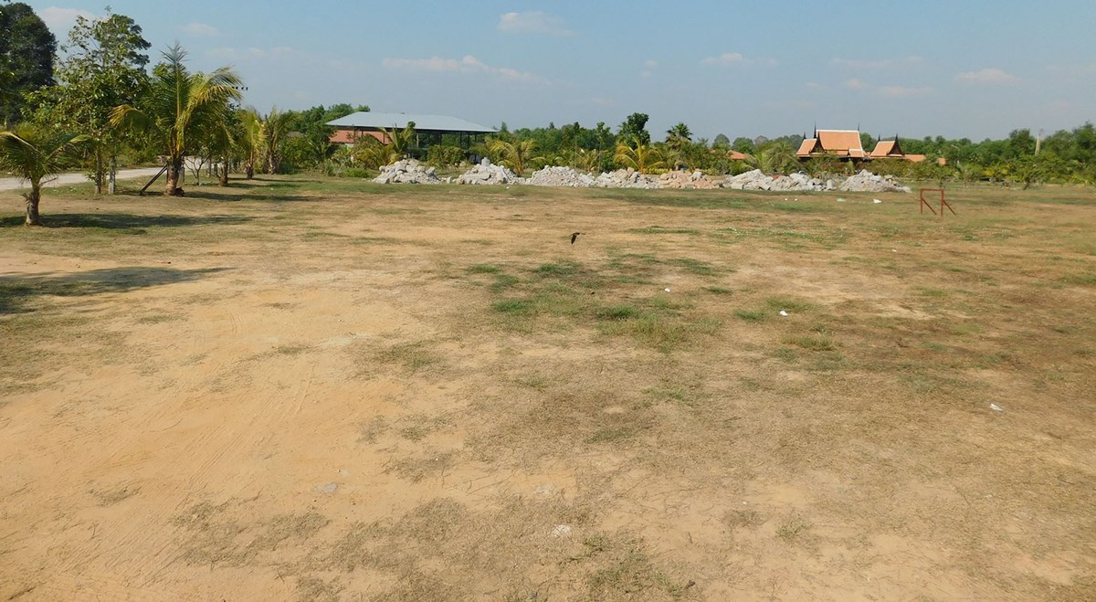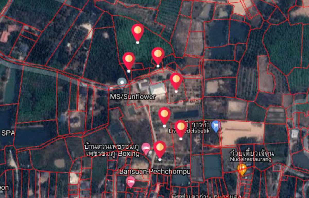 The land consists of a total of 7 land areas with their own title deeds. On 4 of those that are connected there is a large residential building, a resort with 8 guest houses, a restaurant with a massage area and a sports facility, best known for Thai boxing. But most of the land is still unused. That area is 14 Rai, 2 Ngan and 4.5 square wha.