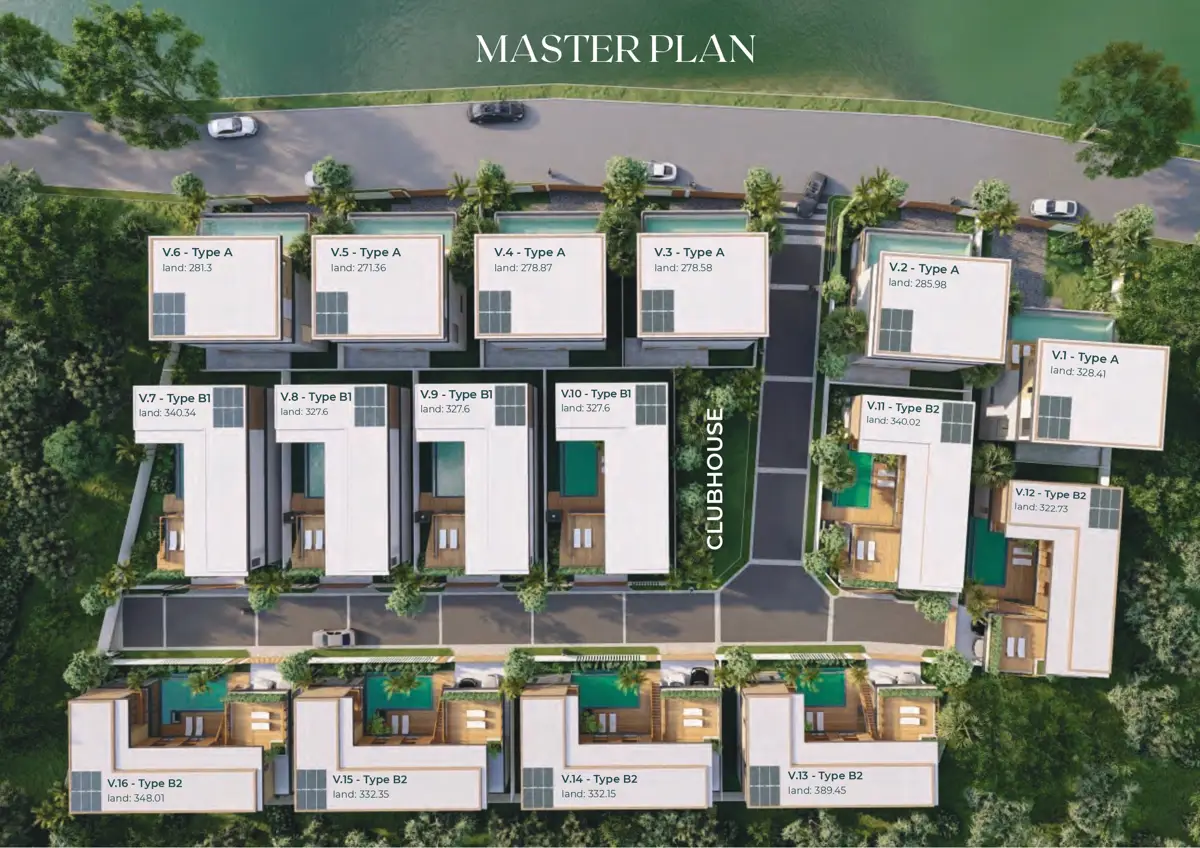 The Type A 3-storey villas (front row) are designed with both luxury and comfort in mind. These villas offer stunning lake views and feature a private swimming pool located on the middle floor, allowing you to enjoy the serene surroundings throughout the day.