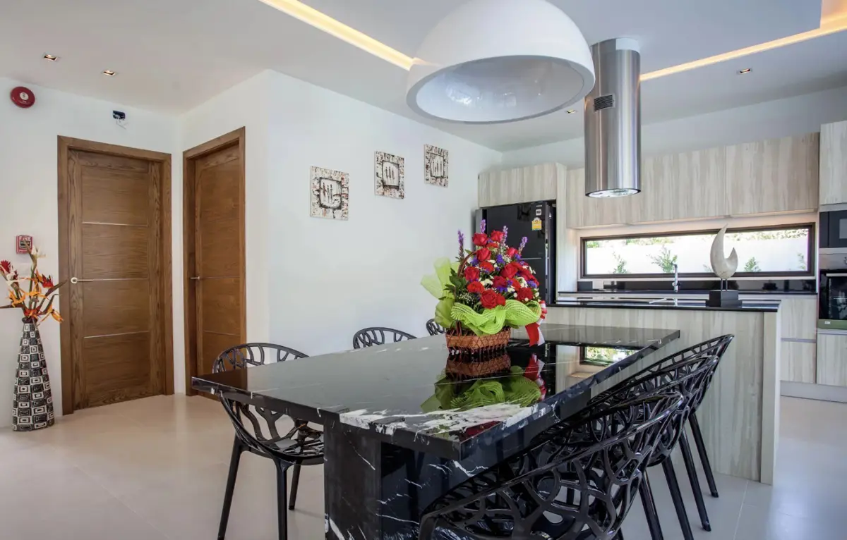 The property features a bright open-plan living and dining area, high ceilings, and large sliding glass doors that seamlessly connect indoor spaces with the outdoor terrace and swimming pool. The fully equipped modern kitchen comes with high-quality appliances, while all bedrooms include en-suite bathrooms for added comfort and privacy.