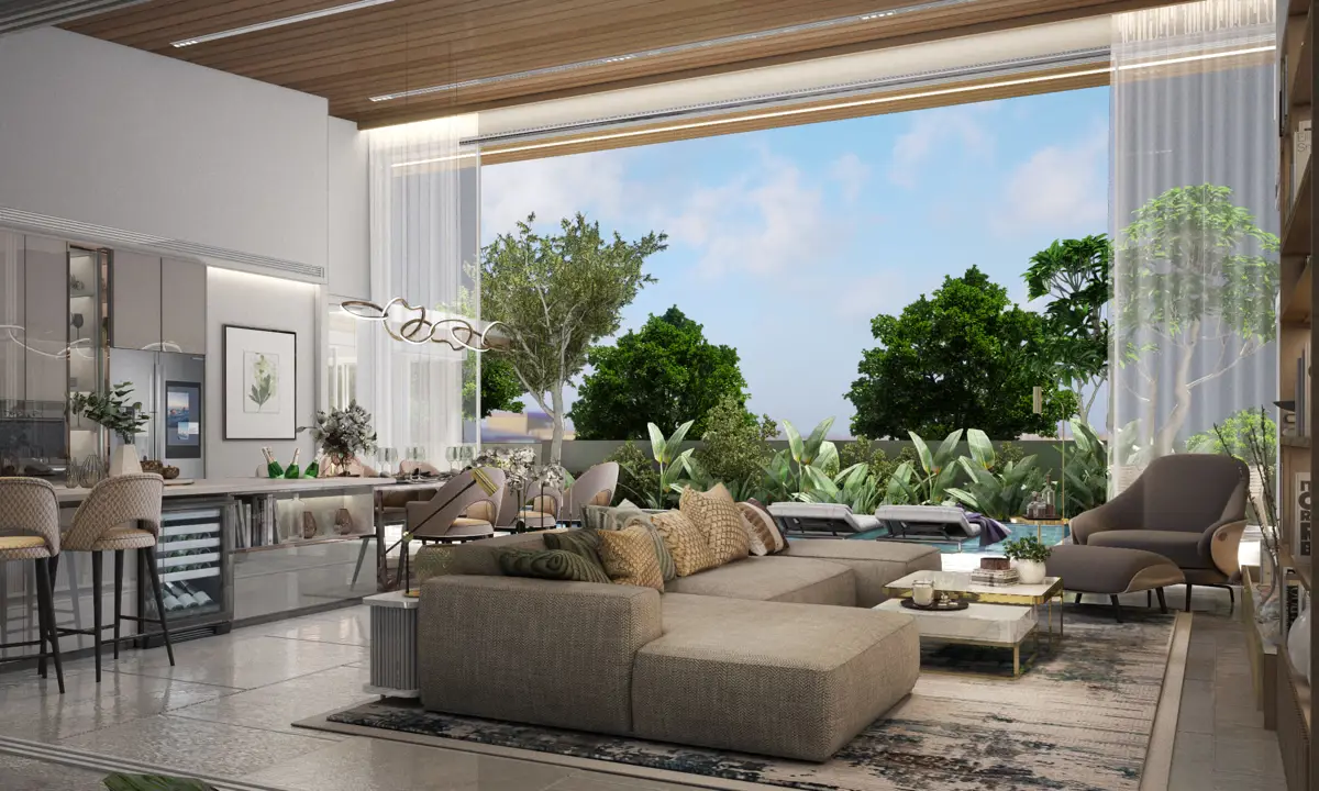 Step inside to discover a space that feels both expansive and intimate. The living area opens into a seamless flow between the dining room, the fully equipped European kitchen, and the lounge, each space bathed in natural light. High ceilings and warm tones enhance the sense of openness, while full-height glass doors frame the views of the lush private garden and pool.