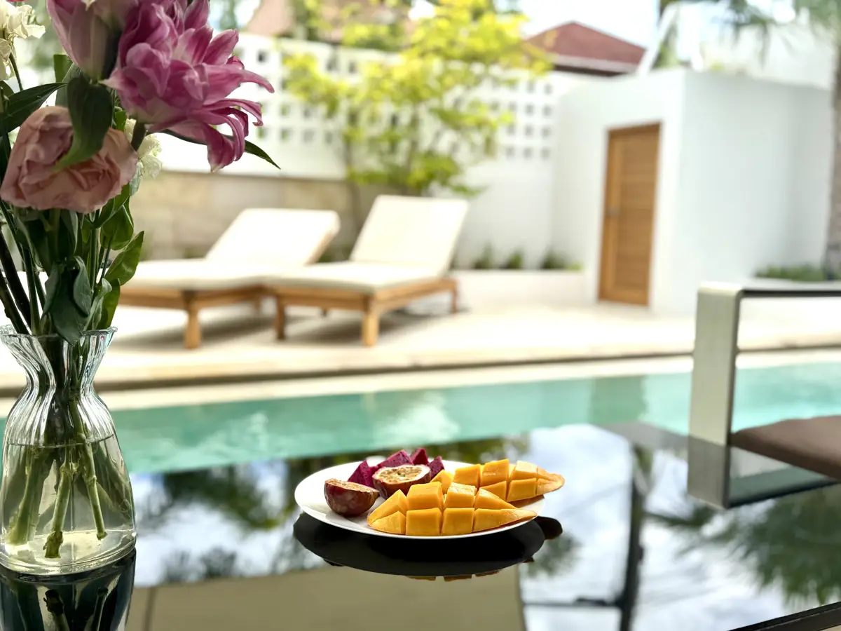 Private swimming pool with integrated jacuzzi, surrounded by a generous sun deck and tropical landscaping.