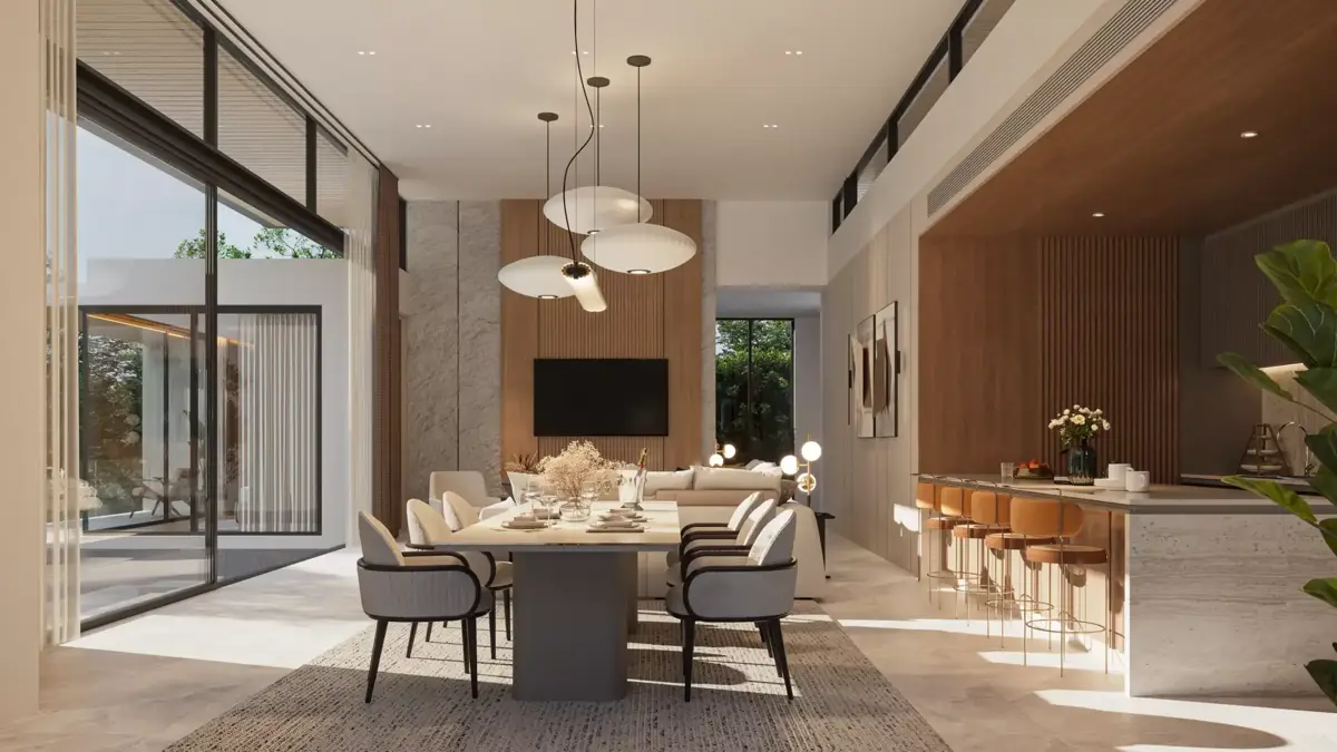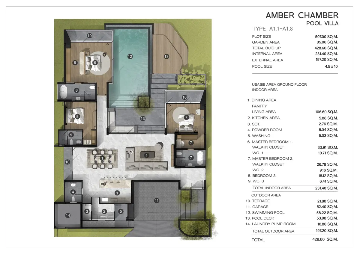 Amber Chamber Essence is a luxurious modern villa designed to elevate your living experience with ultimate harmony and full privacy. Spanning a total area of 507 Sq.m., this single-story residence features 3 bedrooms (including 1 master bedroom), 4 bathrooms, a dining area, living room, pantry, and garage. The private swimming pool measures 10 meters in width, complemented by green relaxing spaces nestled in natural surroundings. The design emphasizes a seamless connection with nature, blending timeless beauty with modern functionality.