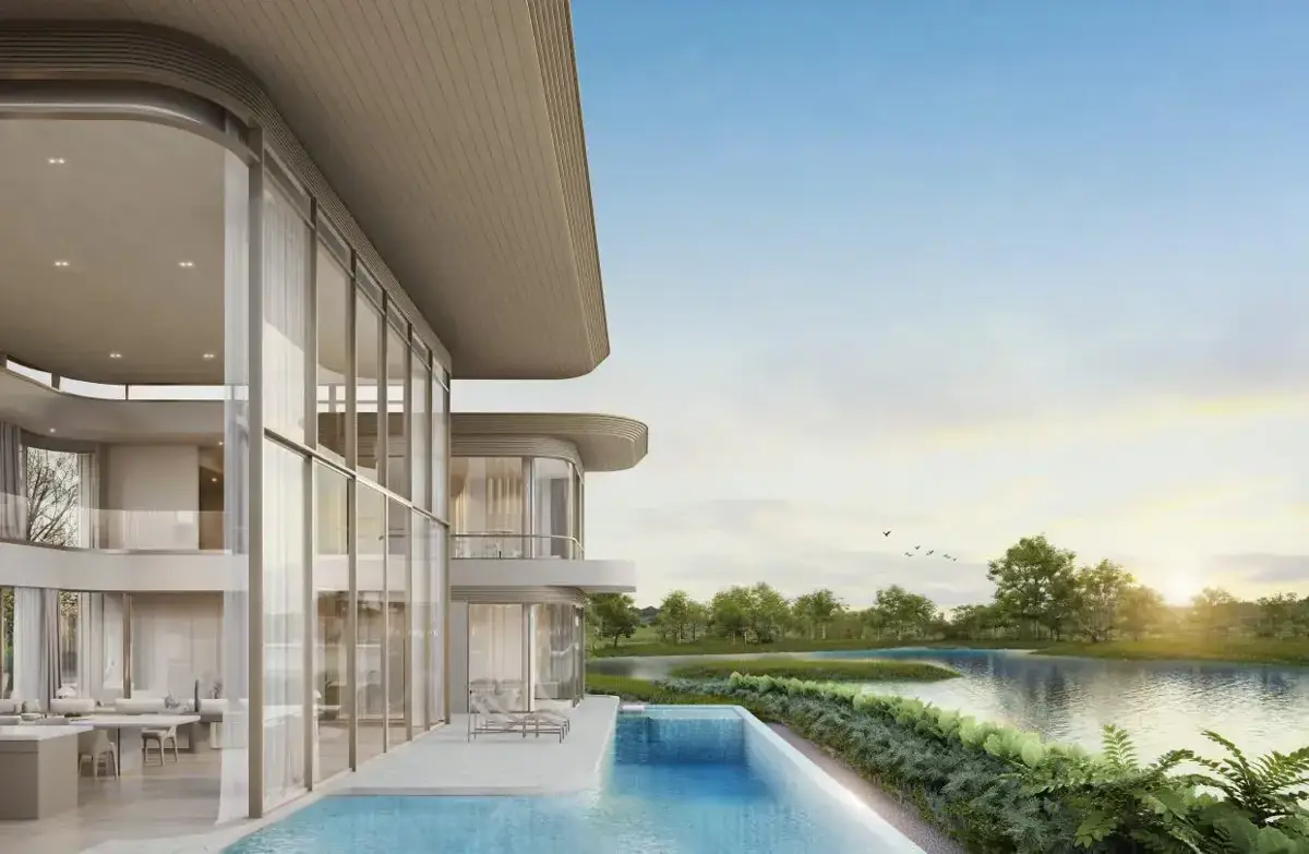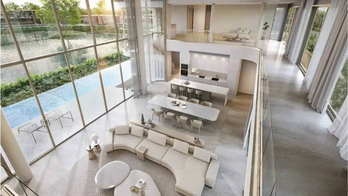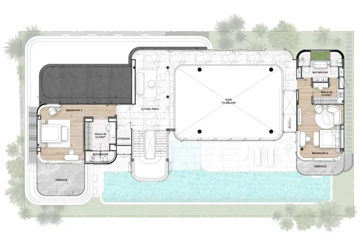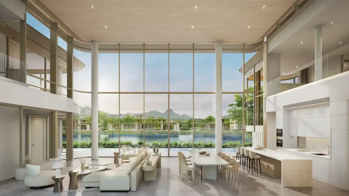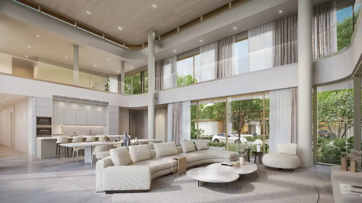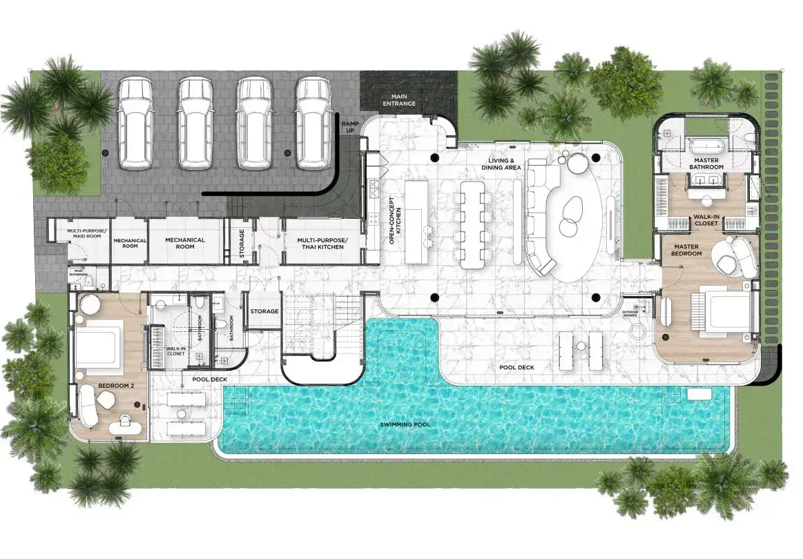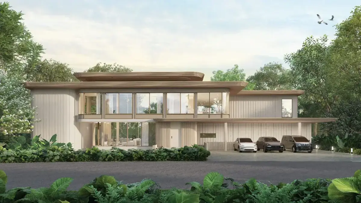 Nanda 4+ at Tri Vananda offers the ultimate luxury living experience with 853 sq.m. of two-storey living space. The villa features three spacious bedrooms, including two master suites, convertible multi-function room, expansive open-plan living and dining areas, and Tri Vananda’s iconic curved glass wall design.