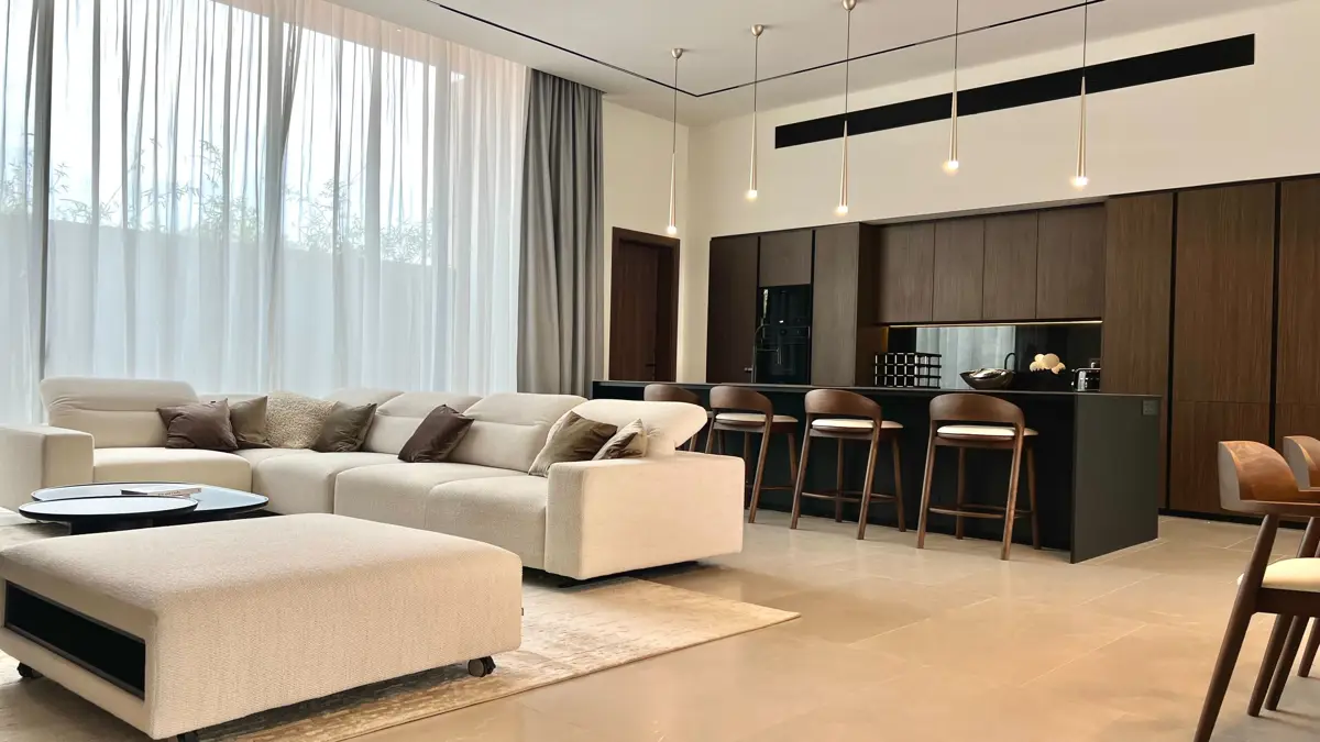 Villa 6 in Sunti Villas offers a spacious and refined one-story layout featuring 3 bedrooms, a private office, and a built-up area of 515 sqm on a 676 sqm land plot. This luxury residence is equipped with a fully furnished interior by Guzzini e Fontana (Italy) and includes a Miton kitchen with island, complete with high-end SMEG appliances. Double-glazed 3.6m windows, Canadian cedar roofing, and a Daikin VRV air-conditioning system ensure top-tier comfort. The villa features a smart home system (KNX), walk-in wardrobes, and a shallow pool for relaxation, all nestled within a gated, landscaped community near Bangtao Beach.