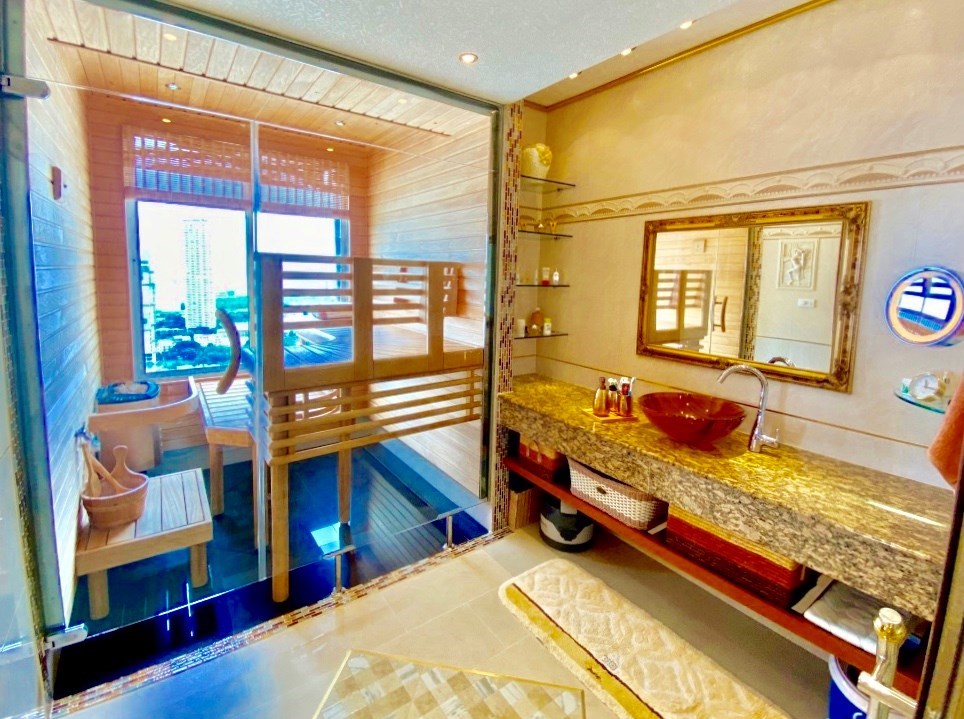 Custom built Finnish Sauna in the Master bathroom featuring Basswood and Pine