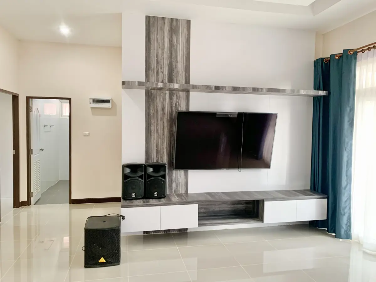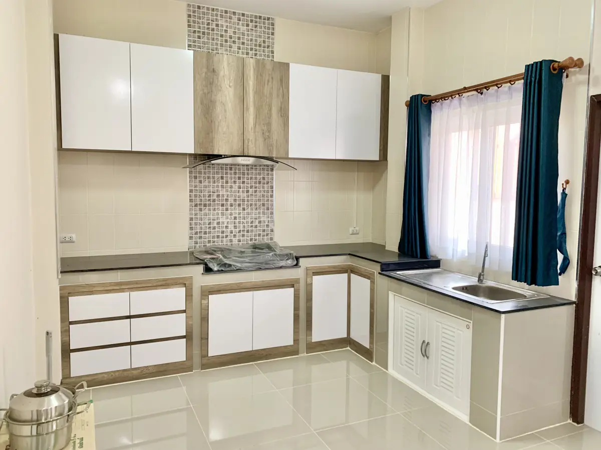 The well maintained and lovely home has never been lived in and is on one of the larger corner lots at The Palm Phala Beach gated community in Ban Chang. It is being offered with large indoor kitchen and also outdoor Thai kitchen area ready. It boasts a large outdoor patio area with a gazebo which is perfect for meals and entertaining, and several mature trees. There are also additional covered areas which were are upgrades, and covered parking for 2 cars. Large size TVs are all included and never been used, and some furniture. There are also very convenient floor to ceiling cupboards in the bedrooms. It is ideally located within steps to the community swimming pool and gym. For those who do not know, The Palm is a well sought after gated community in Ban Chang as it is close to the beaches, convenience stores, Tesco Lotus, DIY, car wash, many restaurants on Phala road, a 711 in the village, near UTP Airport, and also only a few minutes drive to Garden International private school (GIS) and Rayong English Program school (REPS). It is recognizable by its grand enrtrance. The quiet gated community has 24/7 manned security with night patrol, a friendly family oriented atmosphere, and has one of the largest swimming pools in Ban Chang and also a small gym. This property was originally purchased from the developer at the same price as asking price now including numerous upgrades. Buyers who are familiar with the area will know that this property has tremendous value. Reminder, the house has never been lived in and is in pristine condition.