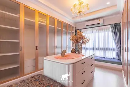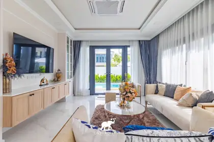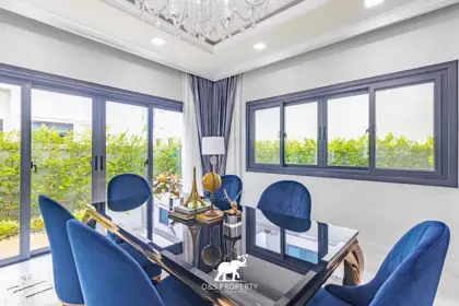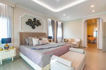 Set on a generous land plot with expansive interior space, the villa features a large private swimming pool, spacious living areas filled with natural light, and stylish interiors that reflect a contemporary tropical lifestyle. The home comes fully furnished with high-end furniture, quality appliances, and thoughtful amenities including a Thai and Western kitchen, separate housekeeper’s quarters, full air-conditioning, and a covered garage for three cars with an EV charging-ready system.