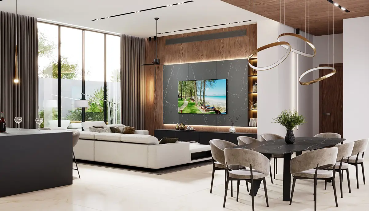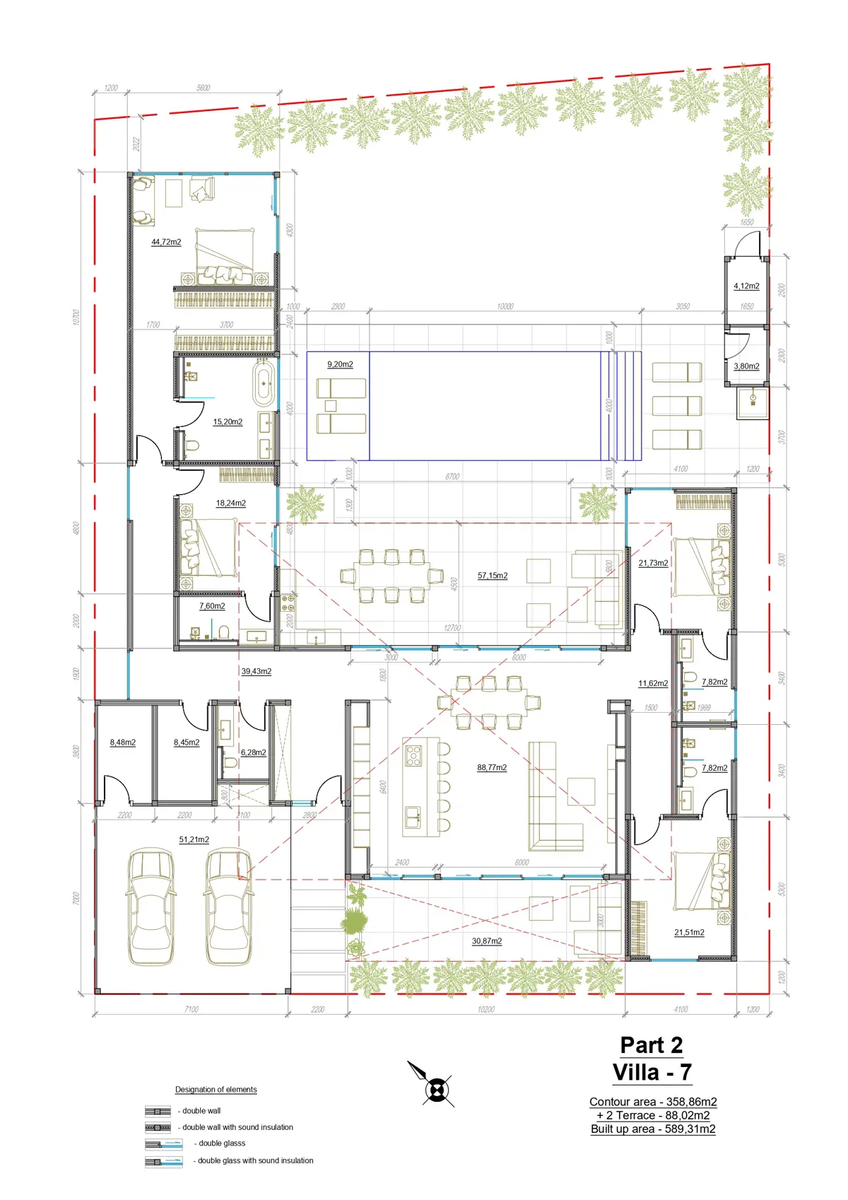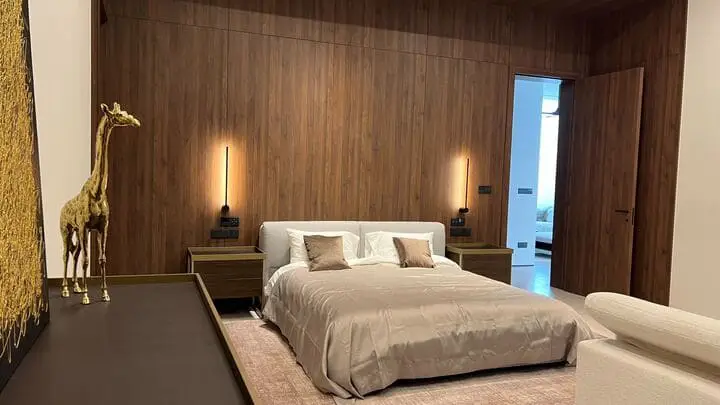 Villa 7 at Sunti Villas is a spacious 4-bedroom residence offering 589 sqm of built-up area on a generous 822 sqm land plot. This elegant single-level home is fully equipped with premium materials including a Miton Italian kitchen, SMEG appliances, and furnishings by Guzzini e Fontana. The home includes a KNX smart home system, walk-in wardrobes, Daikin VRV air conditioning, and double-glazed 3.6-meter-high windows. Designed for comfort and privacy, Villa 7 features a shallow relaxation pool, Canadian cedar roof, and covered parking for 3 cars in a secure gated community near Bangtao and Layan beaches.