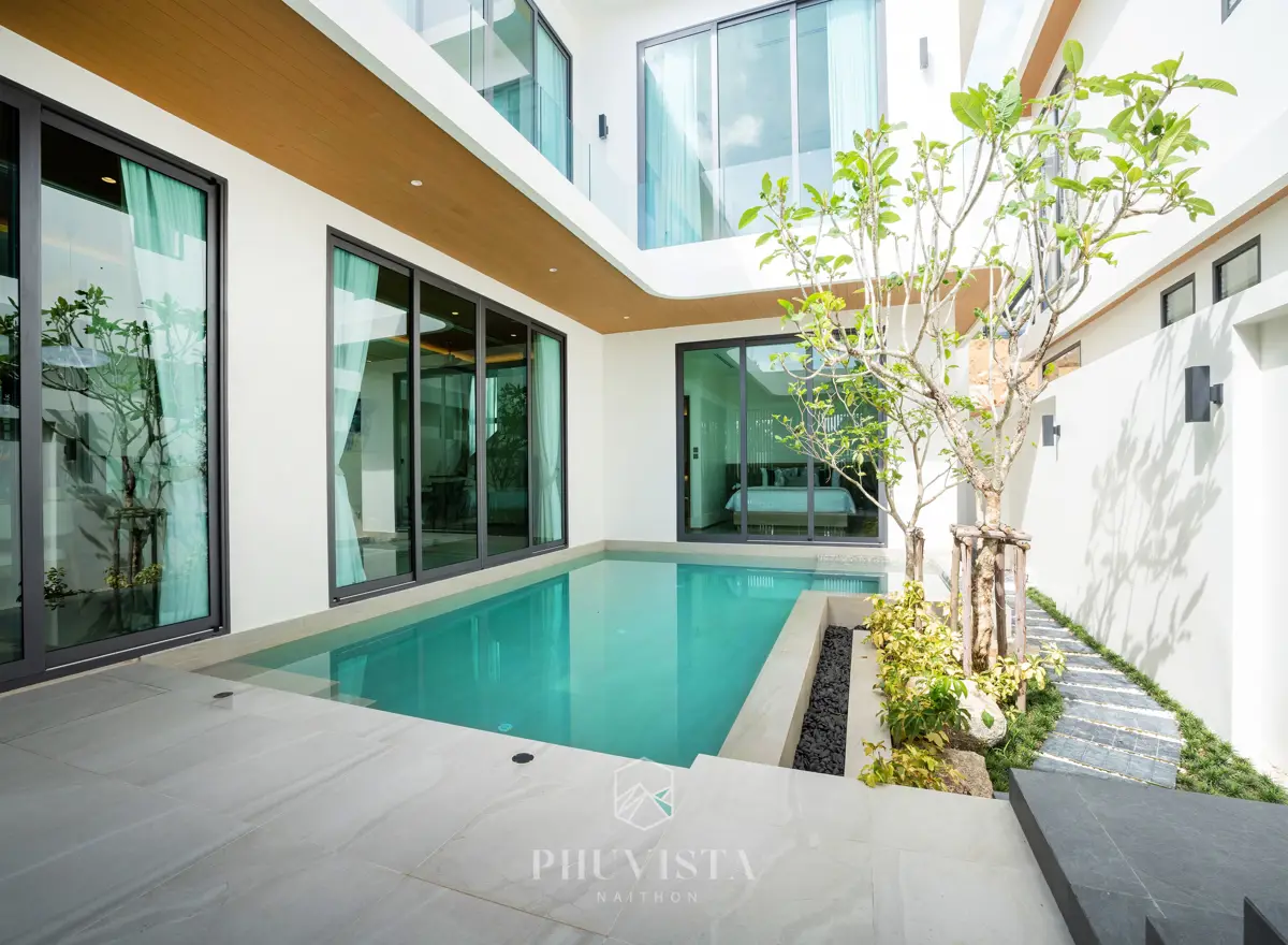 Enjoy the seamless indoor-outdoor lifestyle with a private swimming pool, sunken lounge area, and panoramic mountain and partial sea views. The design emphasizes functionality, privacy, and serenity, all while being minutes from Phuket International Airport, local shops, and dining spots.