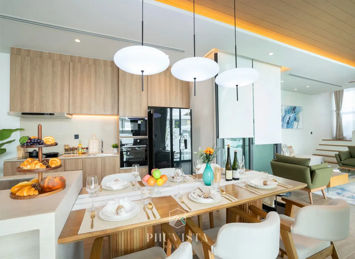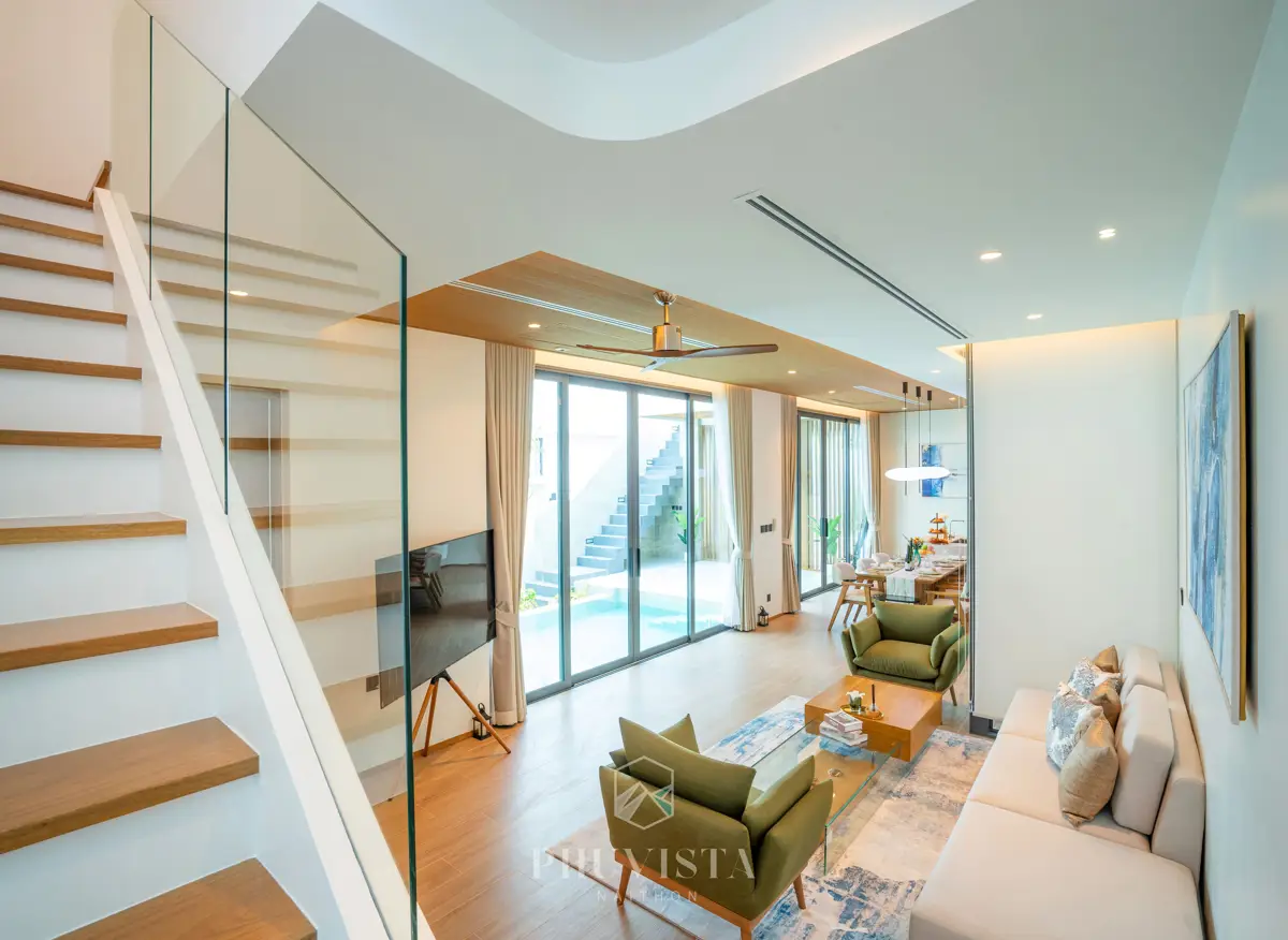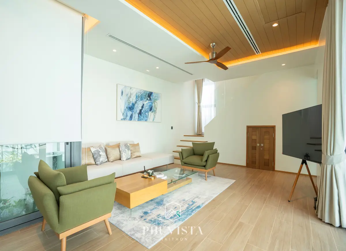 Phuvista1 Type MONTANA is a luxurious 3-storey villa situated just 300 meters from the pristine Naithon Beach. Boasting a total living area of 556.45 sq.m, this residence offers 4 bedrooms and 5 bathrooms, designed for both comfort and timeless elegance. The spacious layout is ideal for families or multi-generational living, with thoughtful features such as an internal lift, maid quarters, and expansive open-plan living and dining areas.