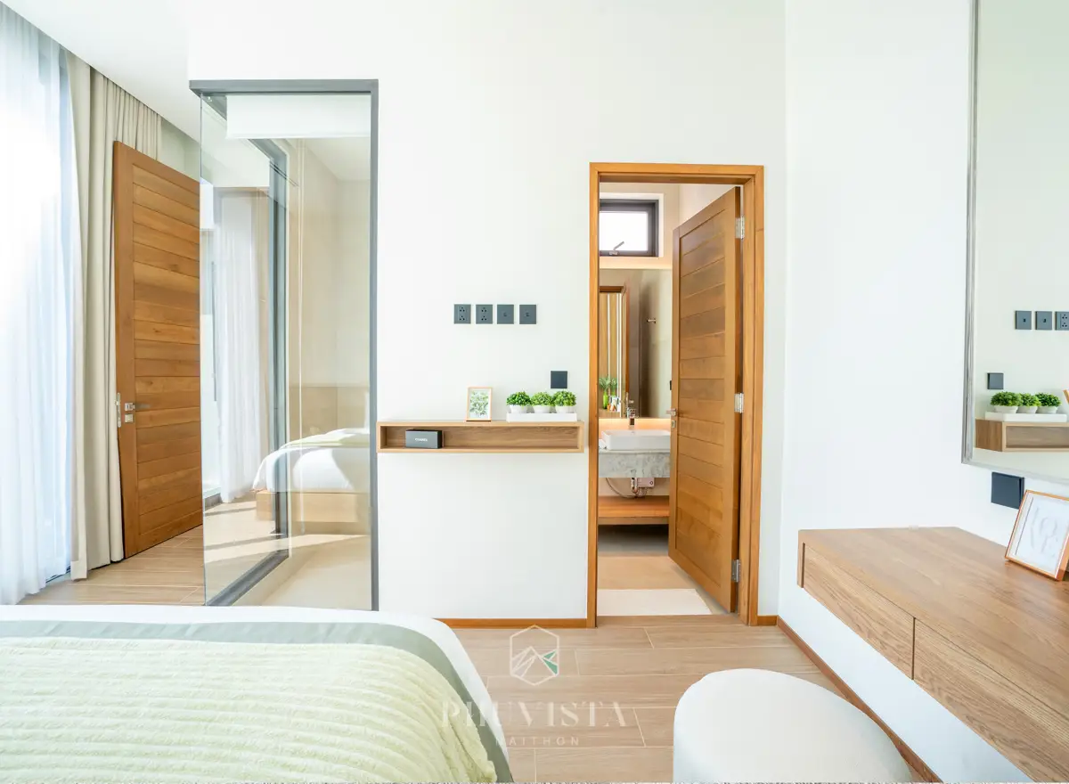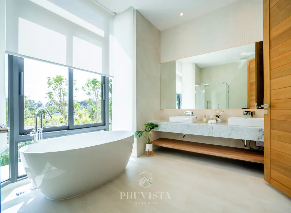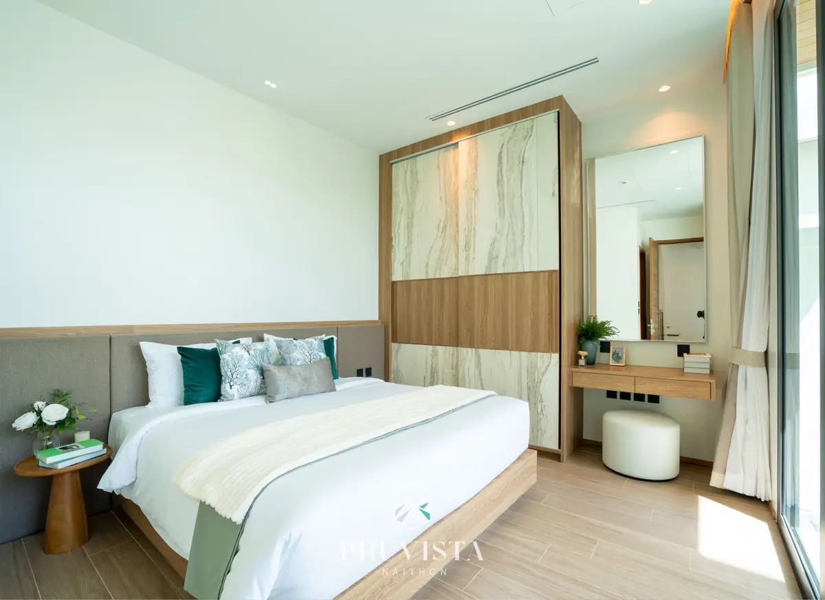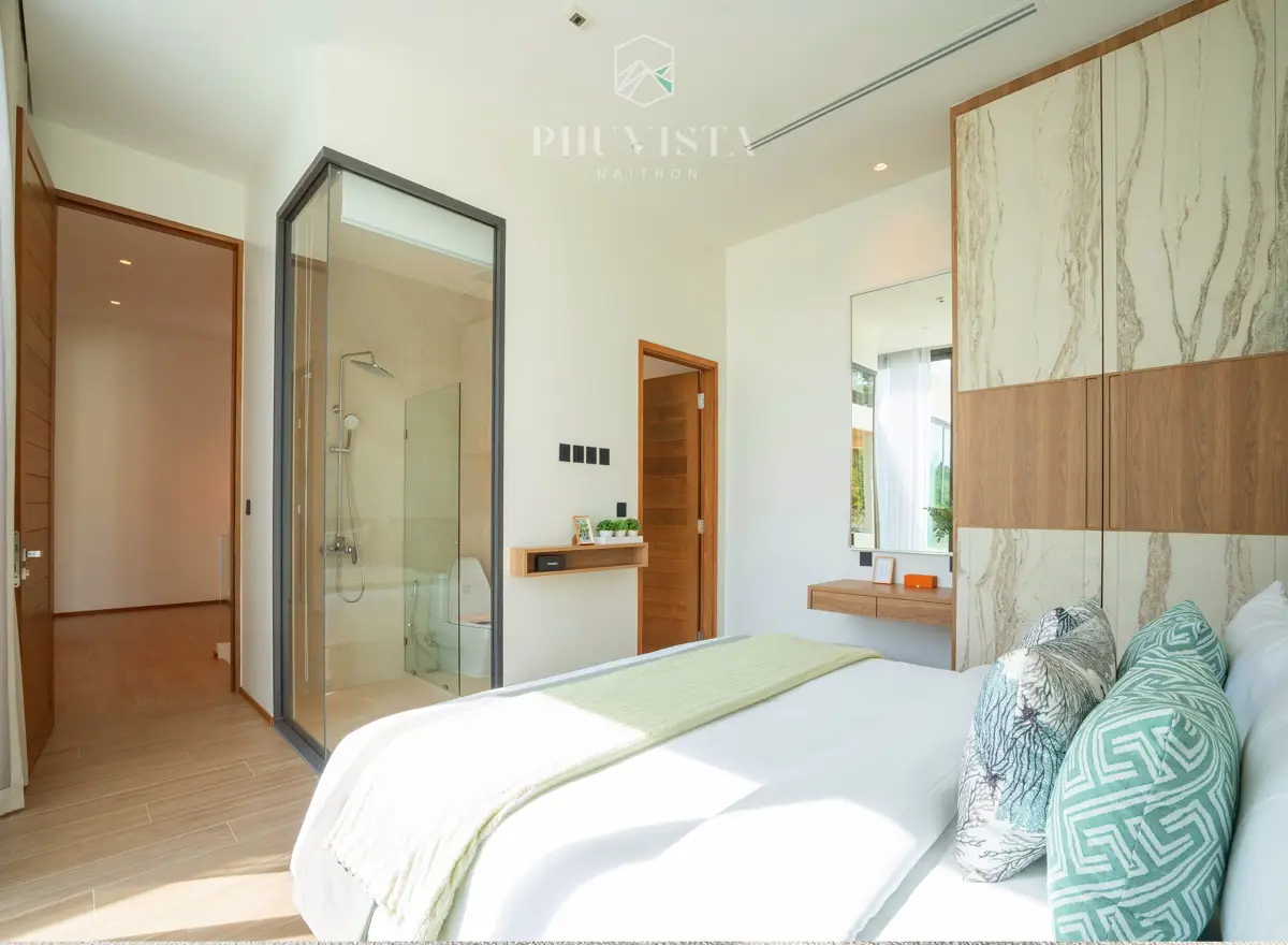 Phuvista1 Type MONTANA is a luxurious 3-storey villa situated just 300 meters from the pristine Naithon Beach. Boasting a total living area of 556.45 sq.m, this residence offers 4 bedrooms and 5 bathrooms, designed for both comfort and timeless elegance. The spacious layout is ideal for families or multi-generational living, with thoughtful features such as an internal lift, maid quarters, and expansive open-plan living and dining areas.