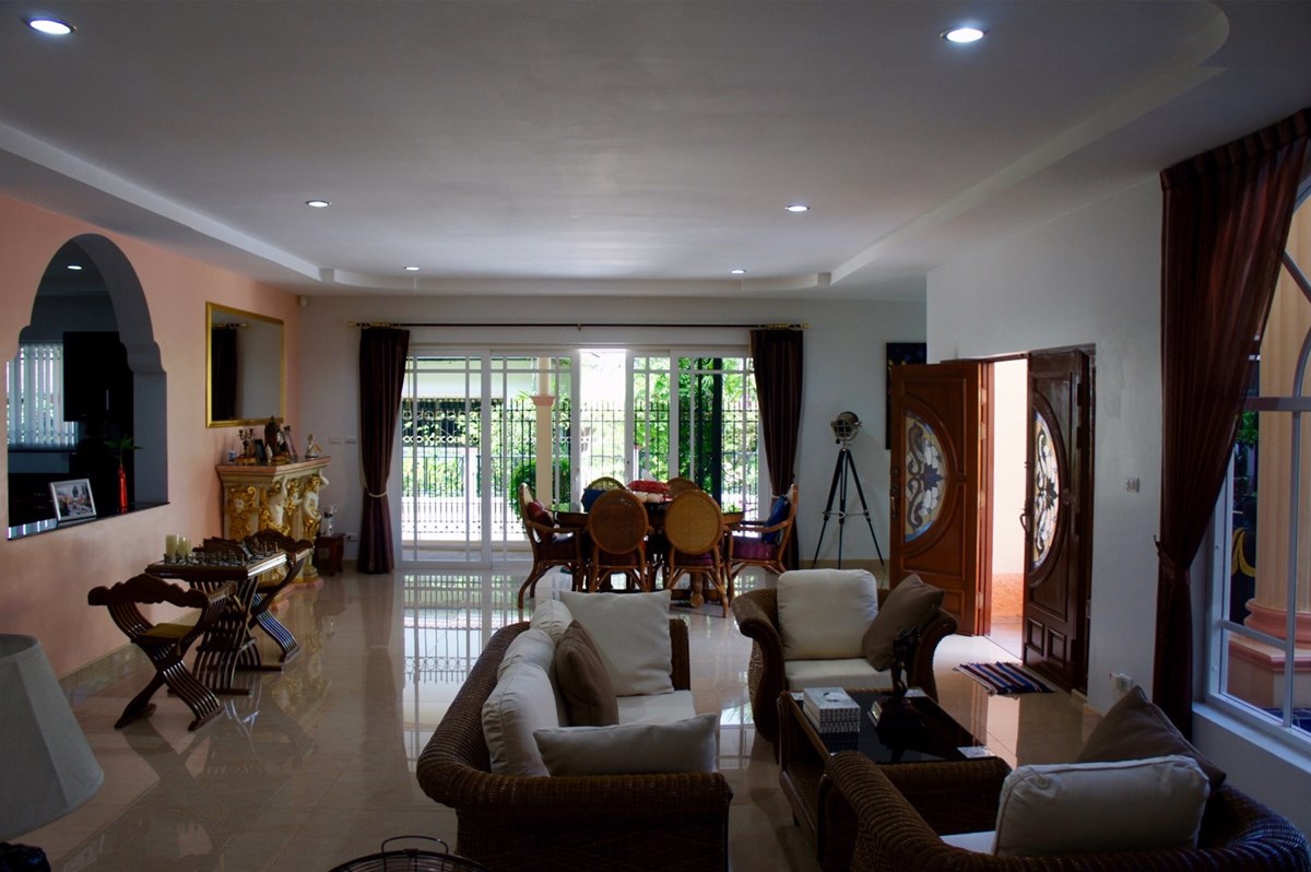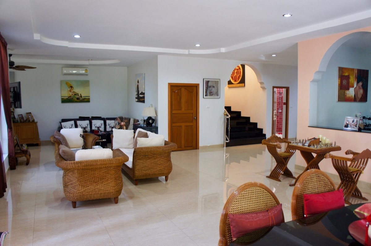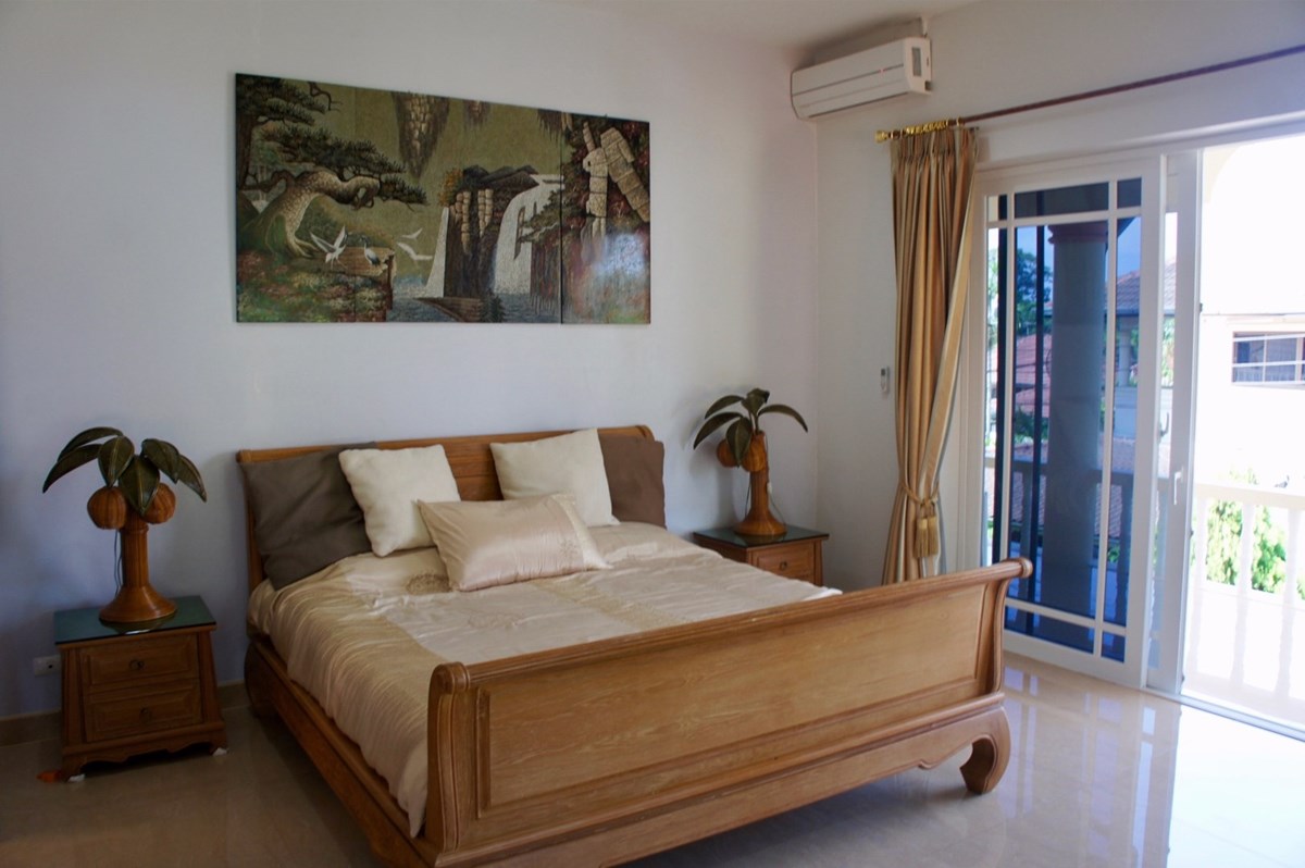 We have personally inspected this villa, just minutes from our office we would love to show it to you. A 4 bedroom, 5 bathroom, architect designed house with large mature landscaped garden on a private road on the beach side of Sukhumvit Road just 400m. from the shore. High quality European style kitchen. Well constructed to high standards and superbly decorated and presented. The magnificent master bedroom features an en-suite with a luxury full size bath and shower. The gardens have a jacuzzi pool and covered seating/barbeque area. There are only 30 houses in this high end peaceful development. The house benefits from its own well. As you will see from the pictures quality abounds in this fine residence and we recommend an early viewing.