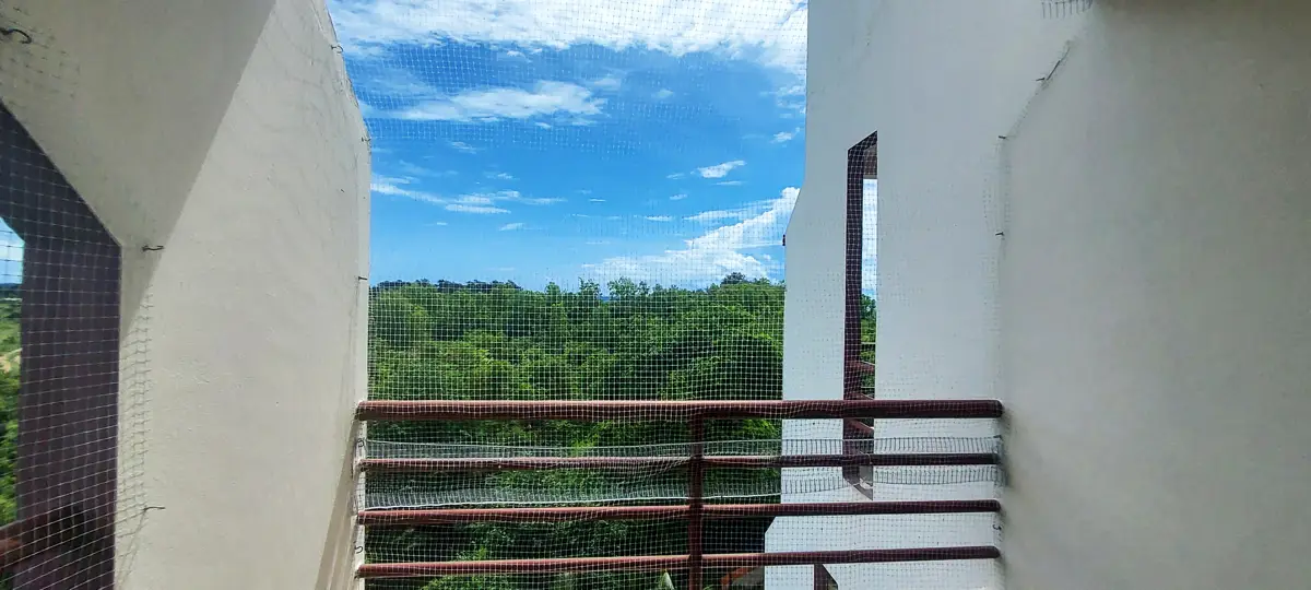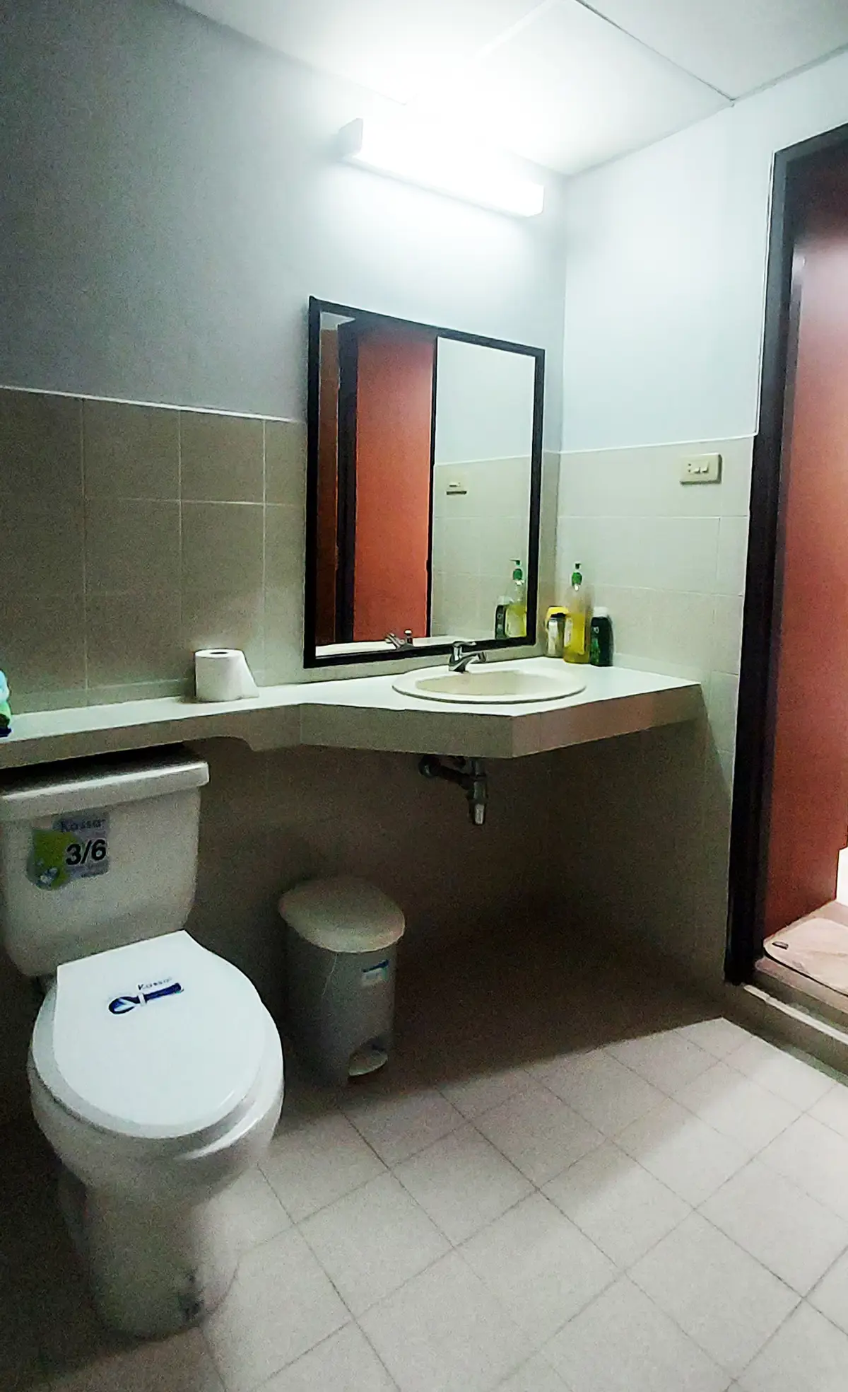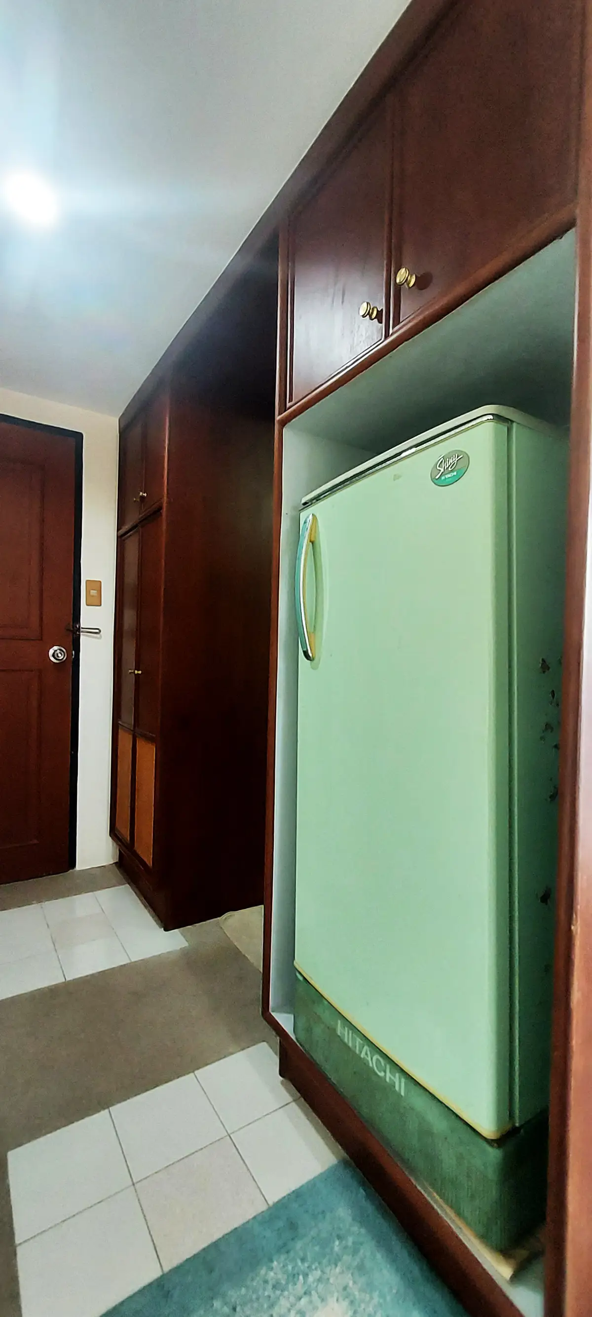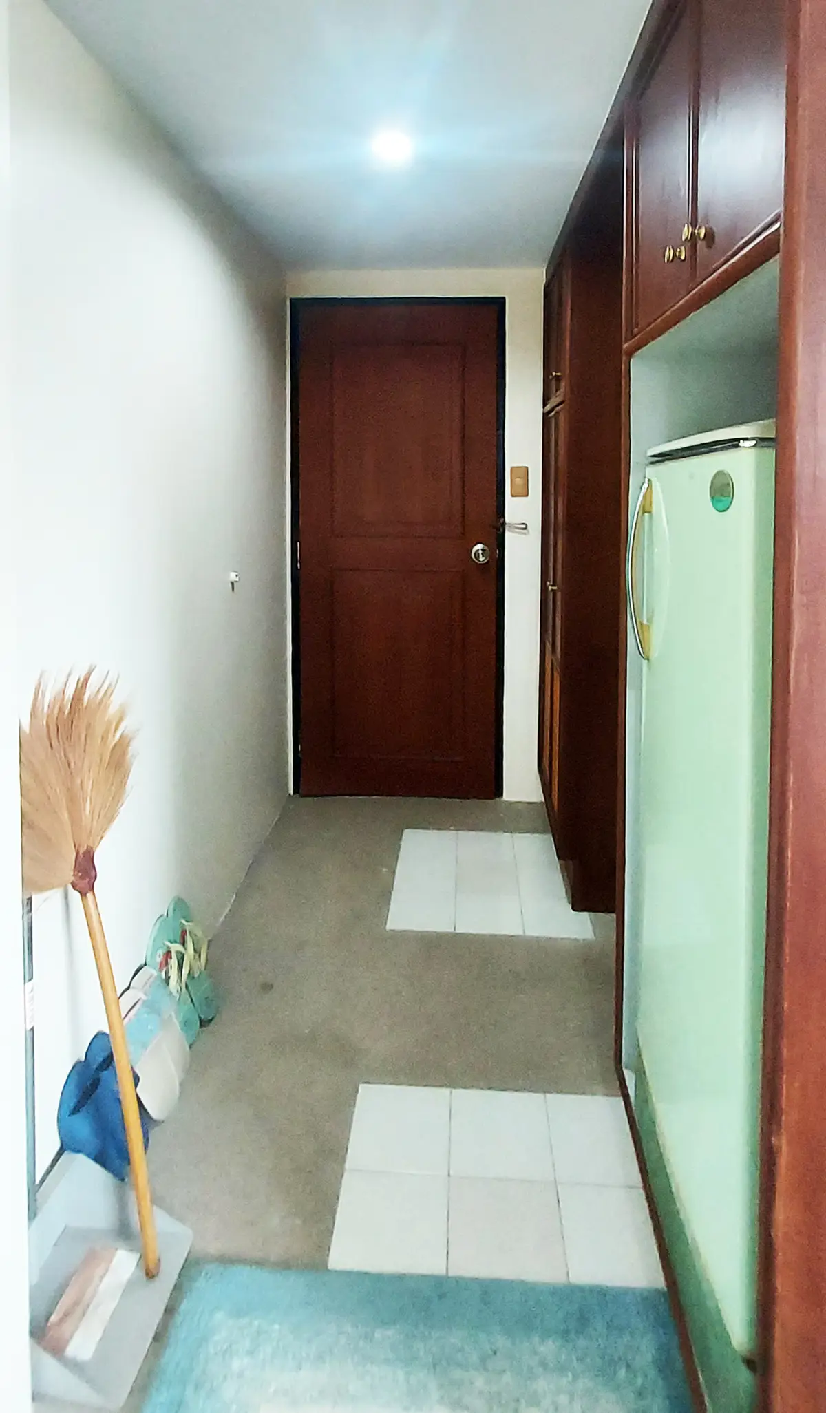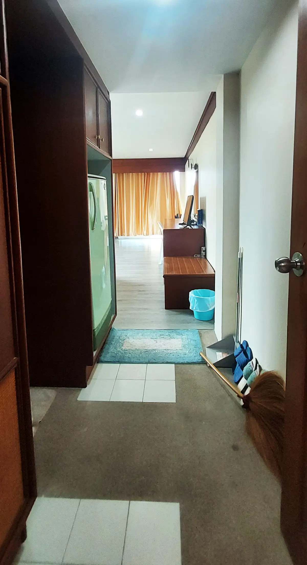 The bathroom is fully tiled. The living room is partly furnished and has a wardrobe and a new AC.