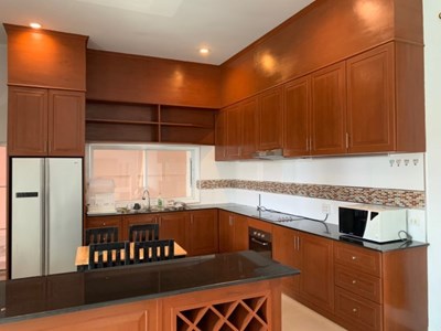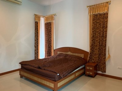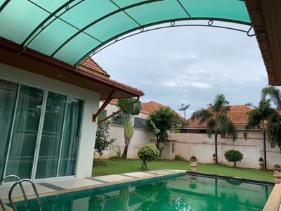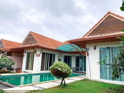 1 Storey single house with large land plot and private pool, 3 bedrooms, 4 bathrooms, storeroom, living area, 3 cars parking, living area 270 Sqm, land 168 Sqm (672 Sqm), 24 hour security, located at Soi Khao Talo, close to school, local market, minimart.