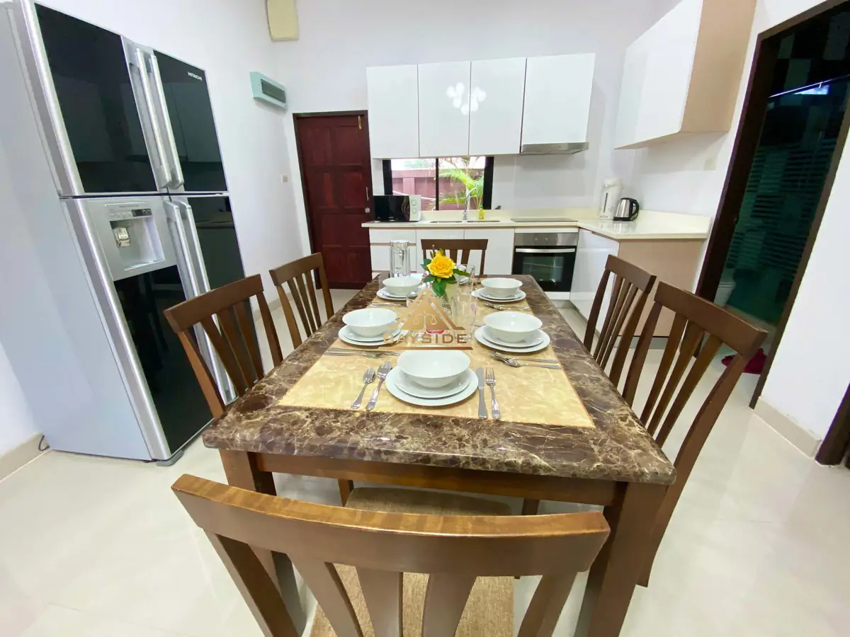 Dining table, Sofa, TV, Refrigerator/Freezer, Microwave, Kettle
