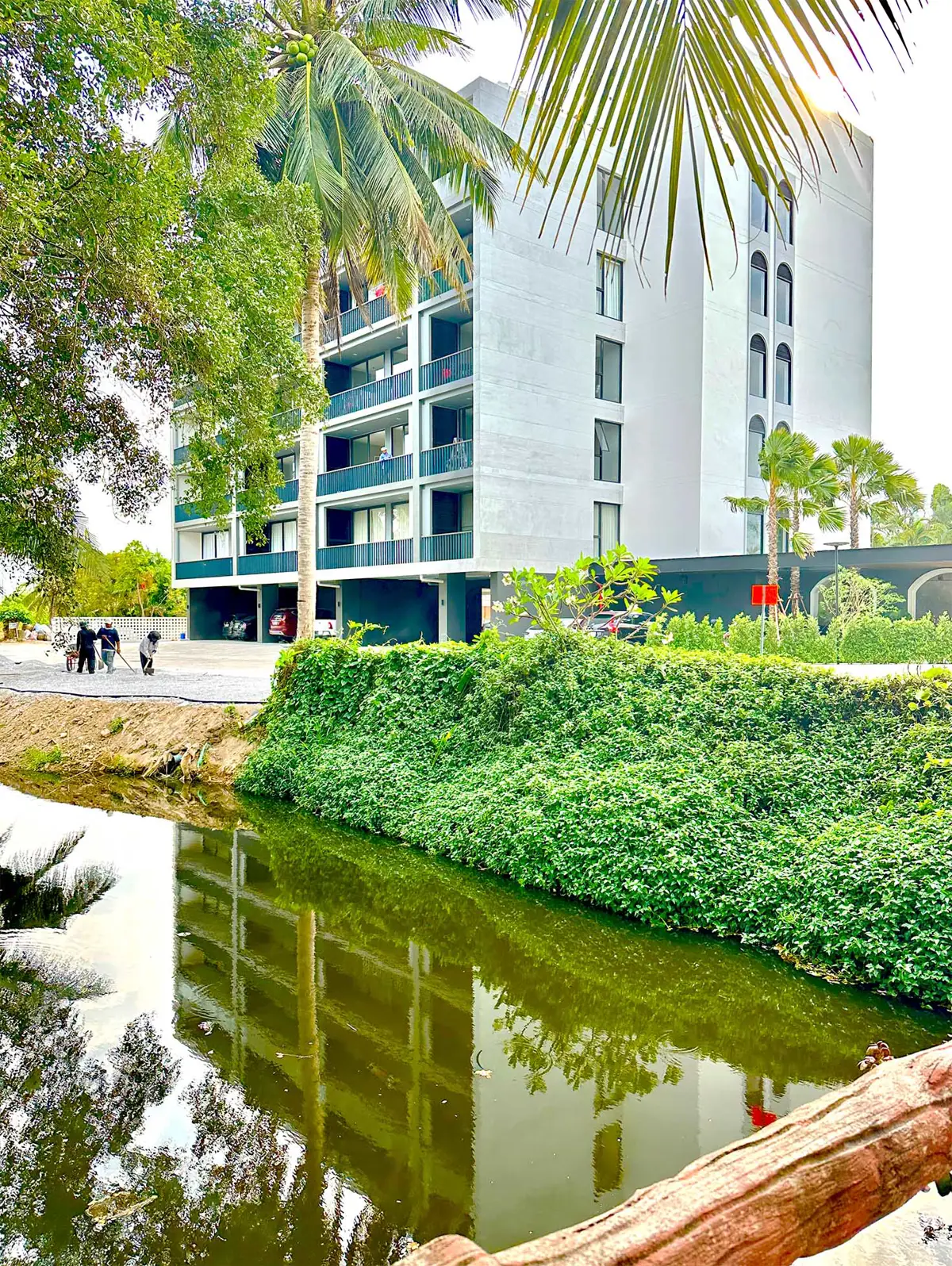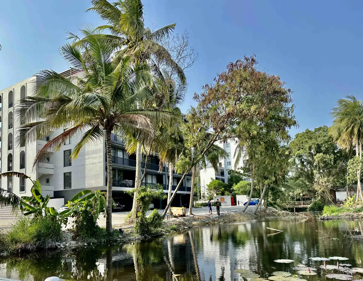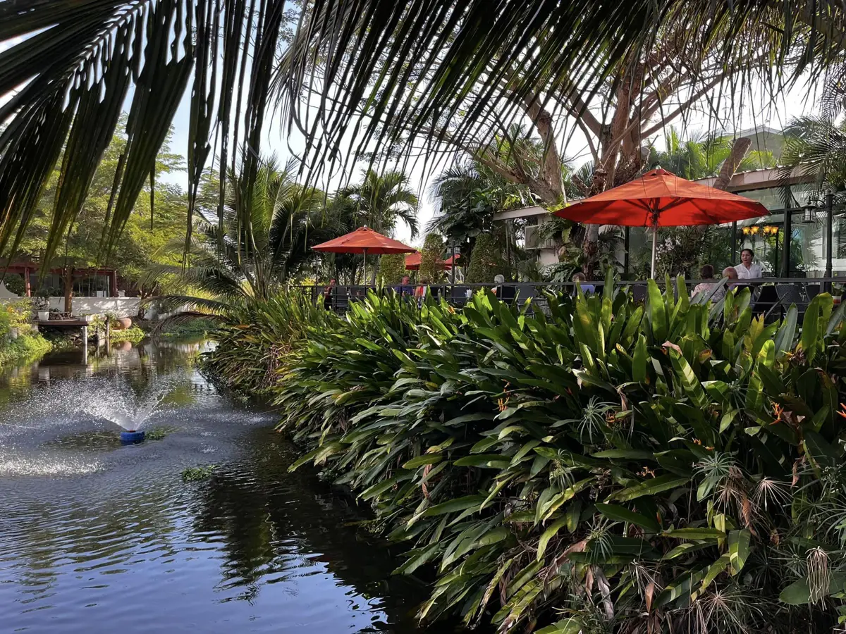 The lush tropical garden featuring multiple pools invites you to relax in cozy private gazebos or by the riverbank, offering opportunities for socializing if desired.