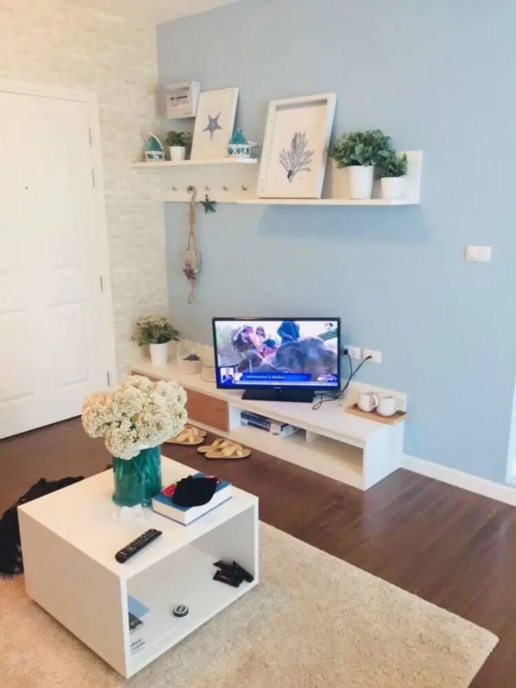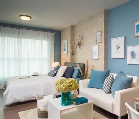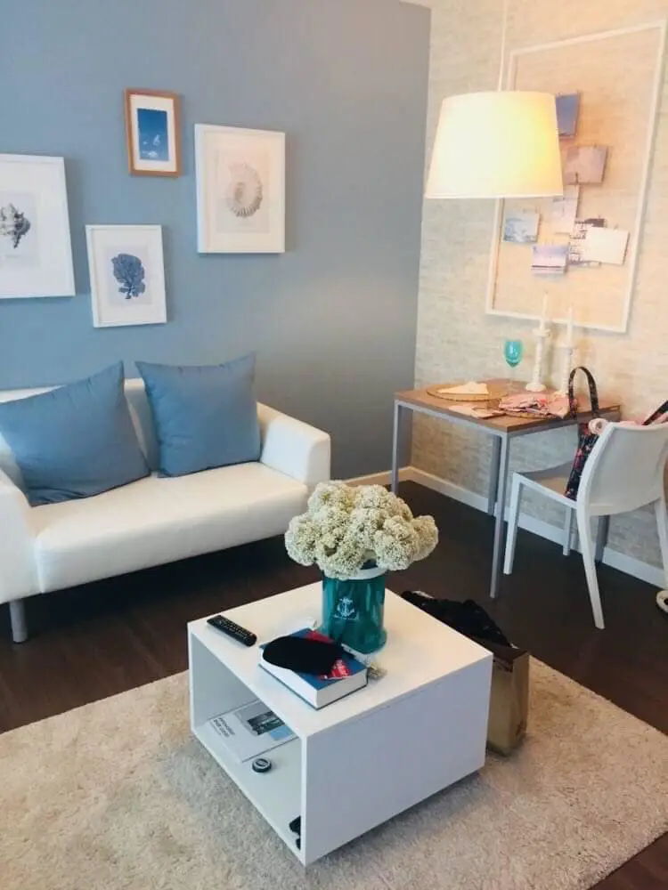 - Immerse yourself in a calming ambiance with the room's blue and white color palette.