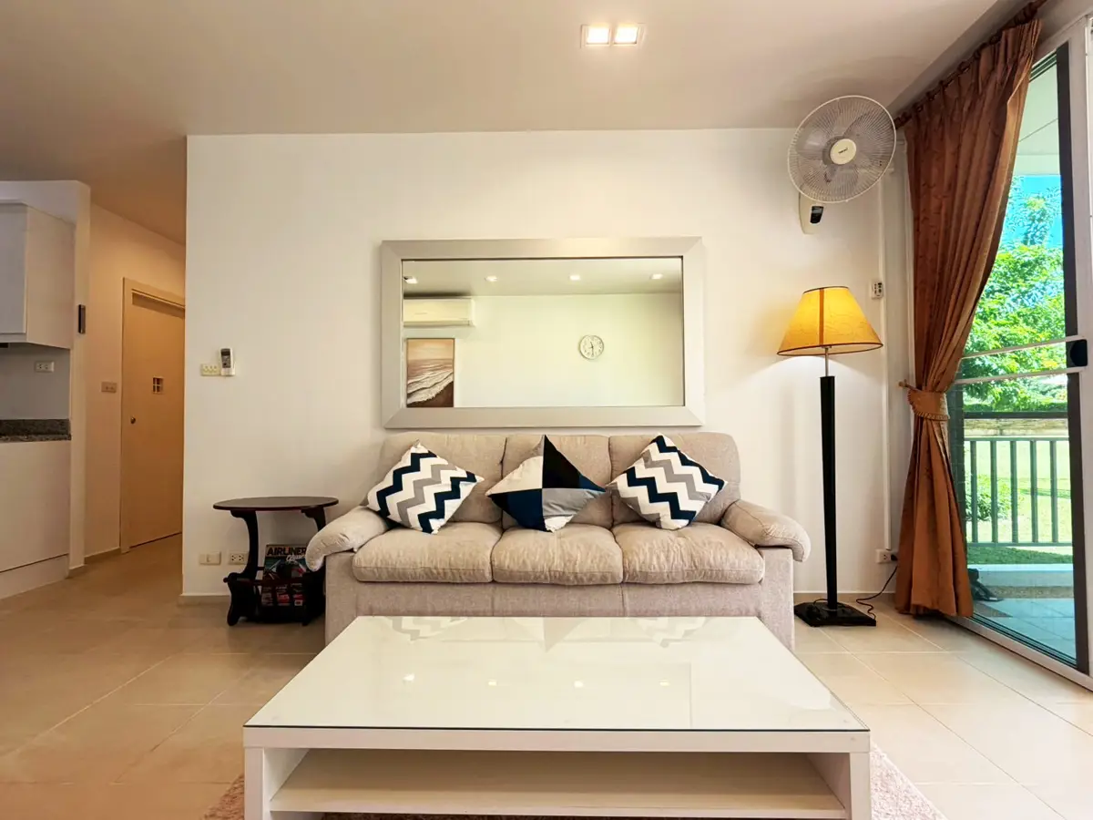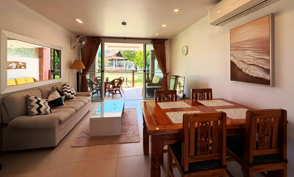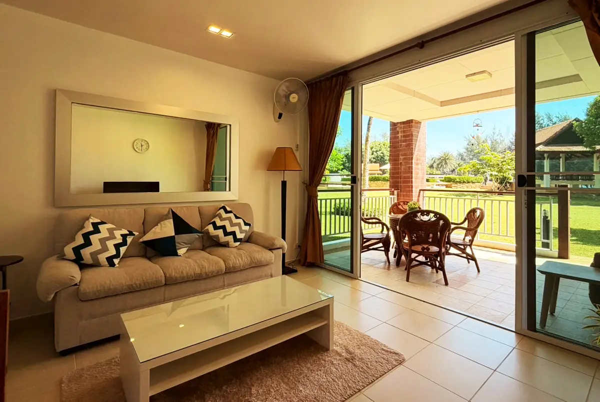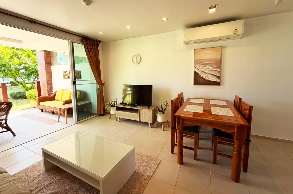 A nice condo in Seaview Condominium with sea views despite being on the ground floor. It is located very close to the 3 km long beach in Laem Mae Phim.