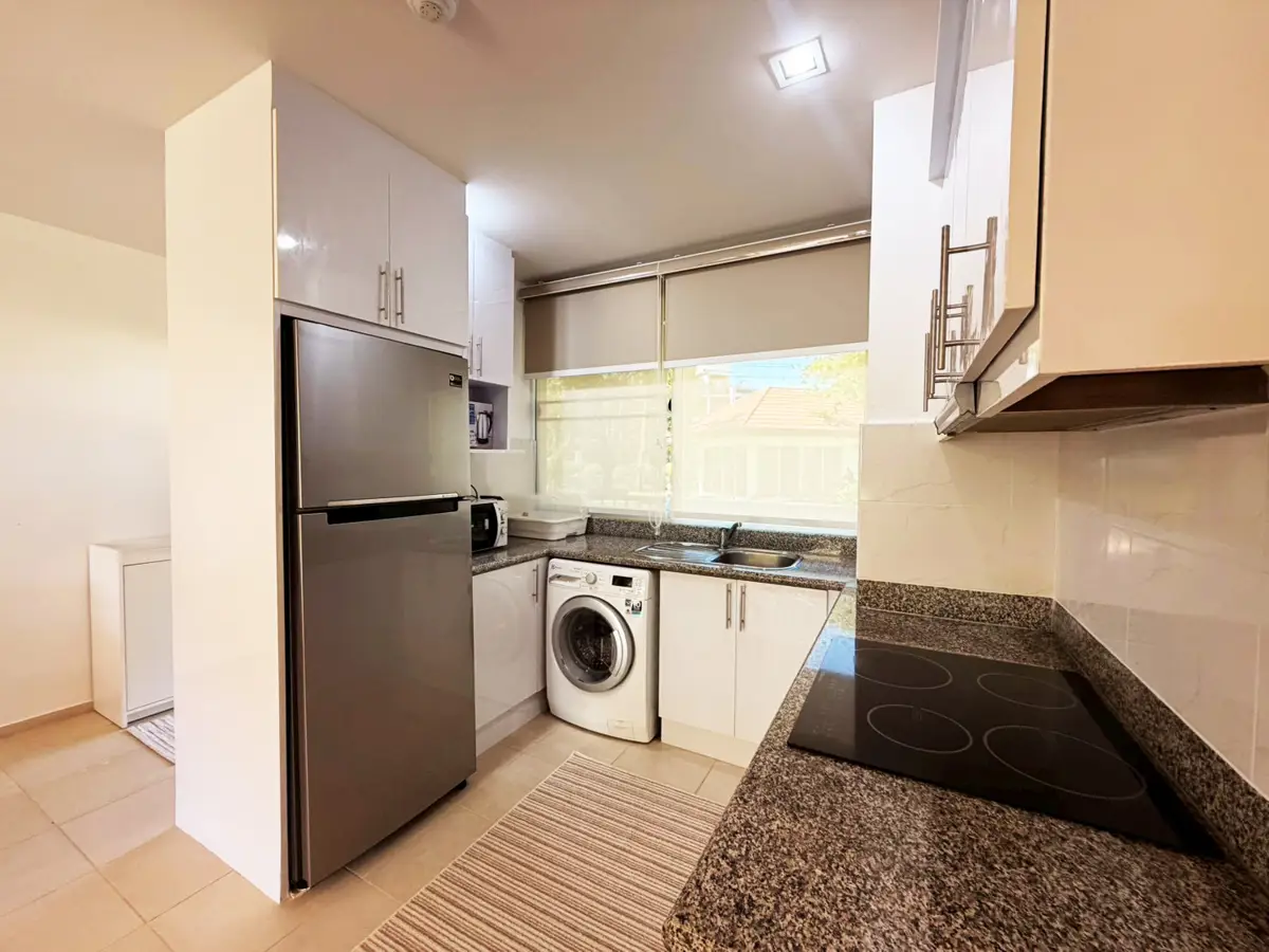 All rooms are equipped with AC. The entire apartment has tiled floors. The kitchen has the usual equipment with plenty of storage and good work surfaces. The kitchen also has a washing machine. Both bathrooms are fully tiled. The generous ceiling height and the large glass areas contribute to a bright and spacious living space. The home is equipped with recessed spotlights in the ceiling in all areas. A central water heater supplies showers and kitchen with hot water.