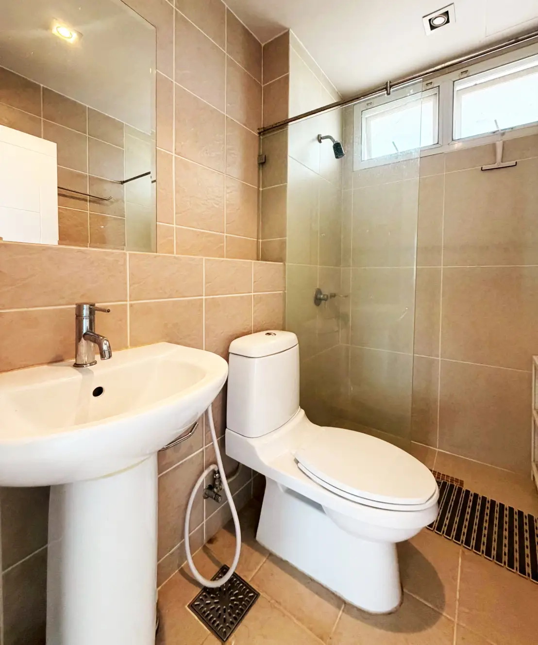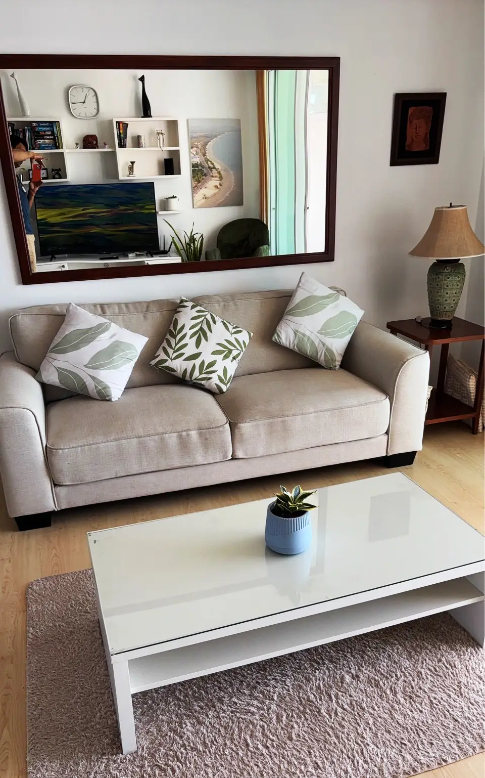 The living space of 82.6 sq m is divided into a large living room, a kitchen, two bedrooms with double beds and one bedroom with a single bed, as well as a bathroom and a toilet. There is also a large balcony overlooking the large communal pool area. From here there is a wonderful view. The condo is located on the 6th floor of 7.