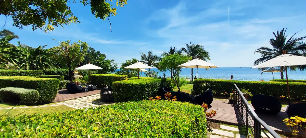 From the balcony, the main view is a garden, but the sea can be glimpsed.