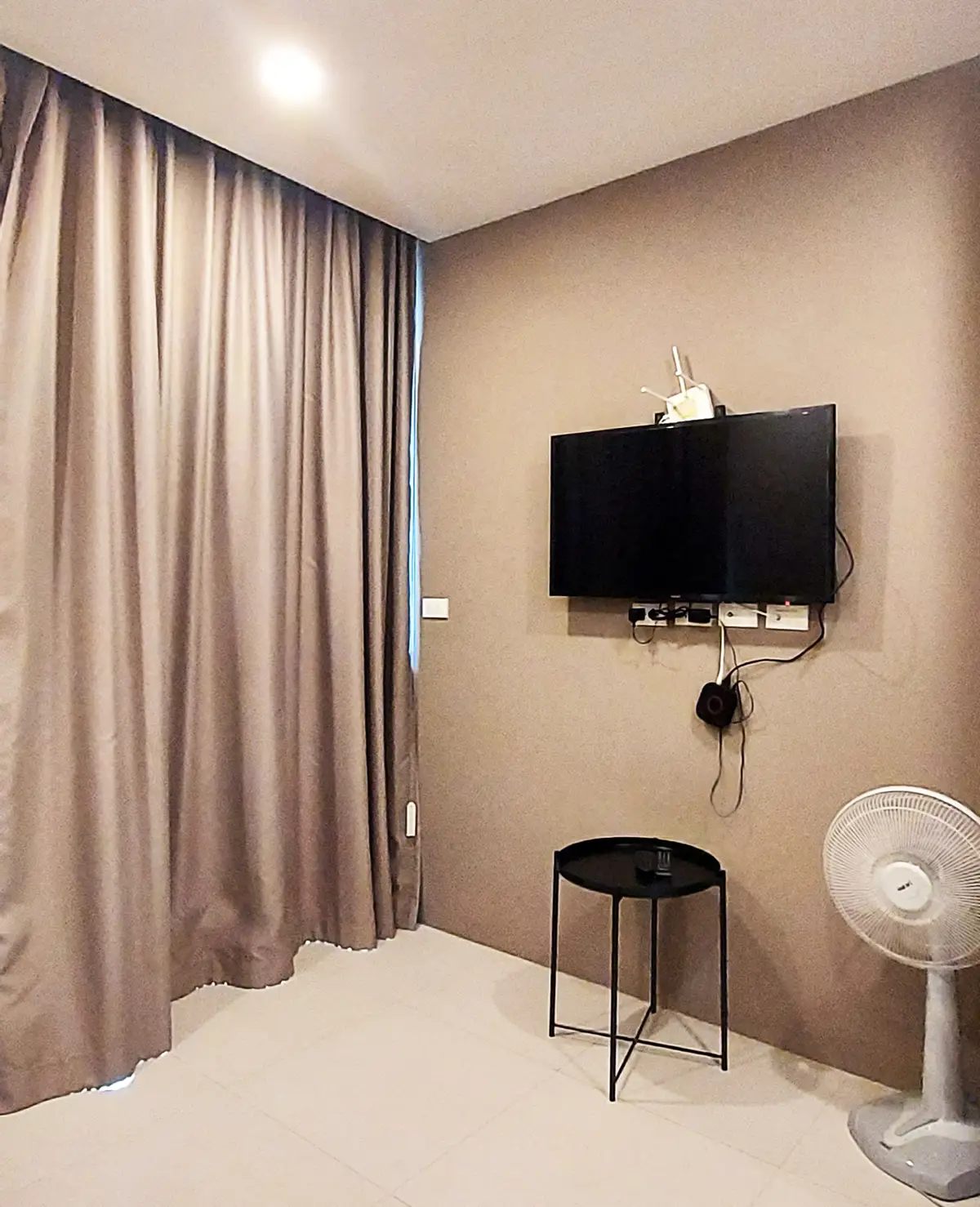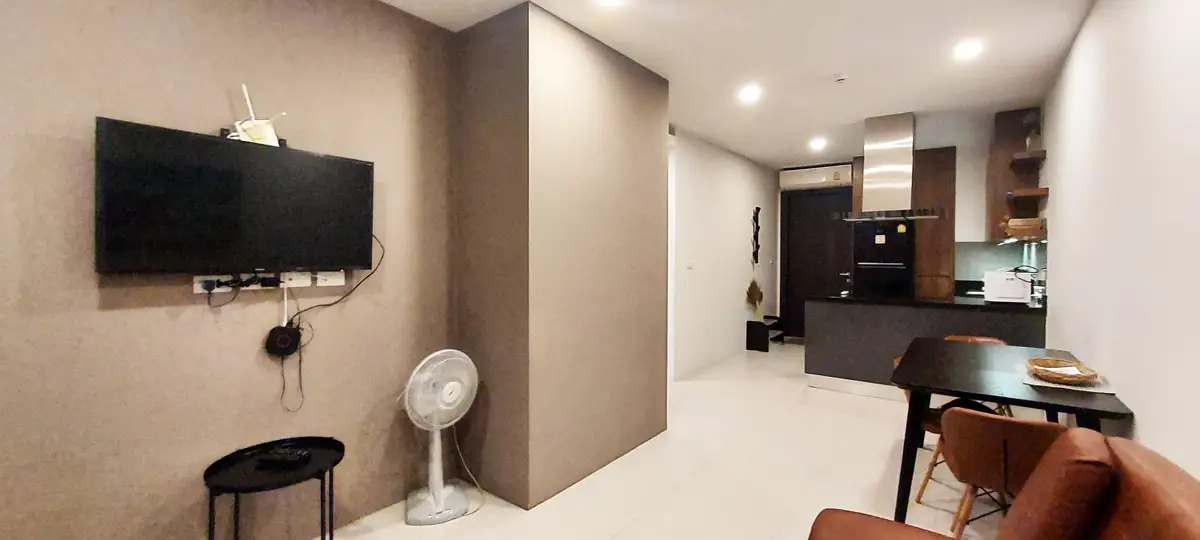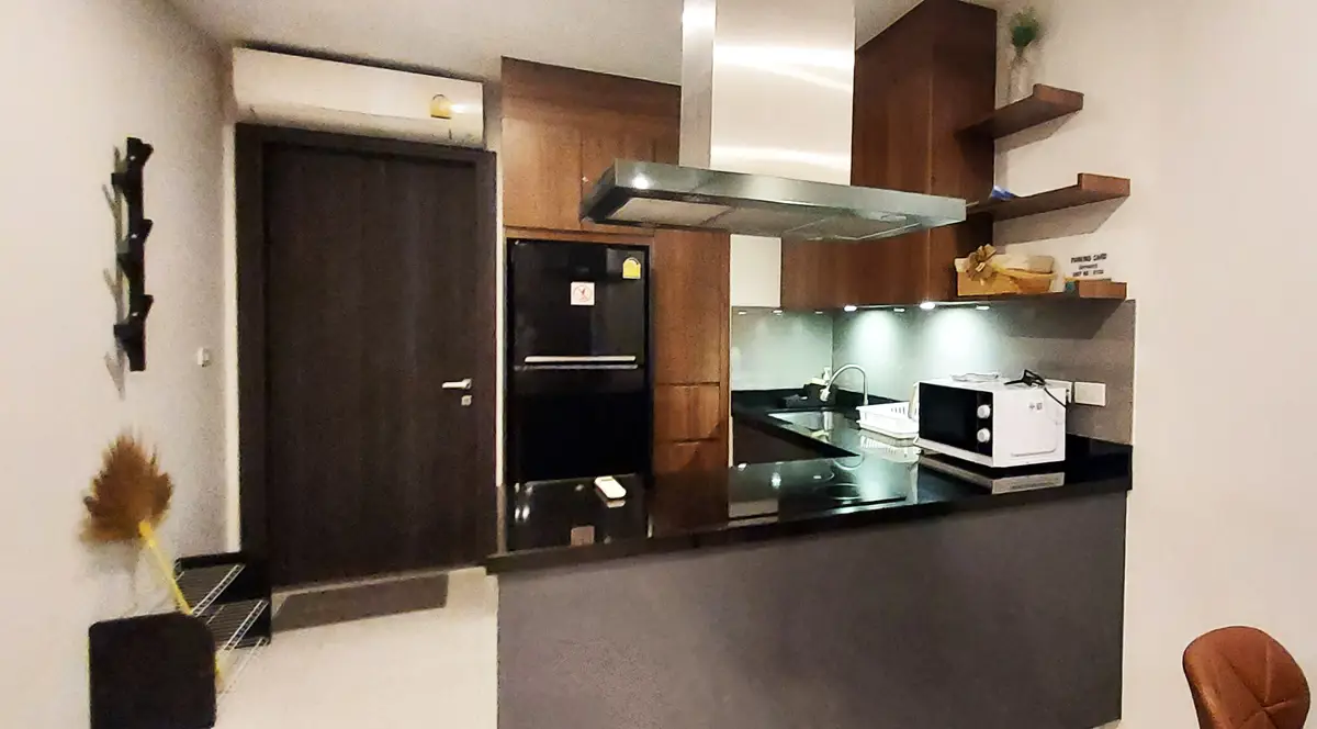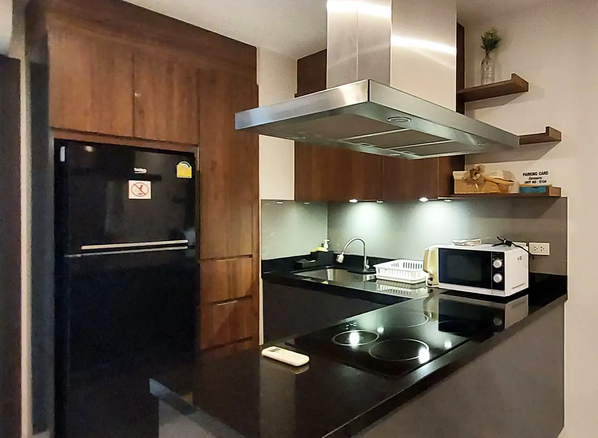 The condo is fully furnished and equipped with 3 ACs, fridge and freezer, 4-burner stove, extractor hood, microwave, other necessary kitchen equipment, floor fan, and TV. The total living area is 49.64 sq m.