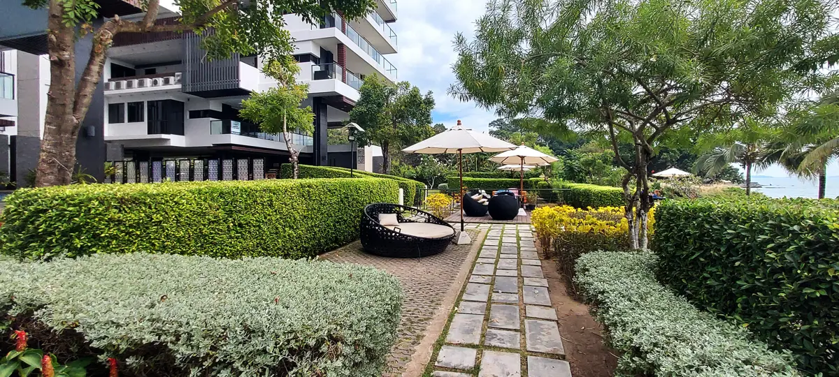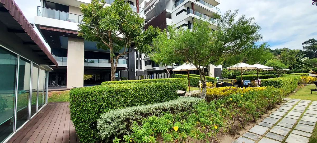 Between the condo building and the beach there is a swimming pool and a very nice garden/park. There is also a restaurant with both Thai and Western food, as well as a gym. There is also a service office and post boxes here.