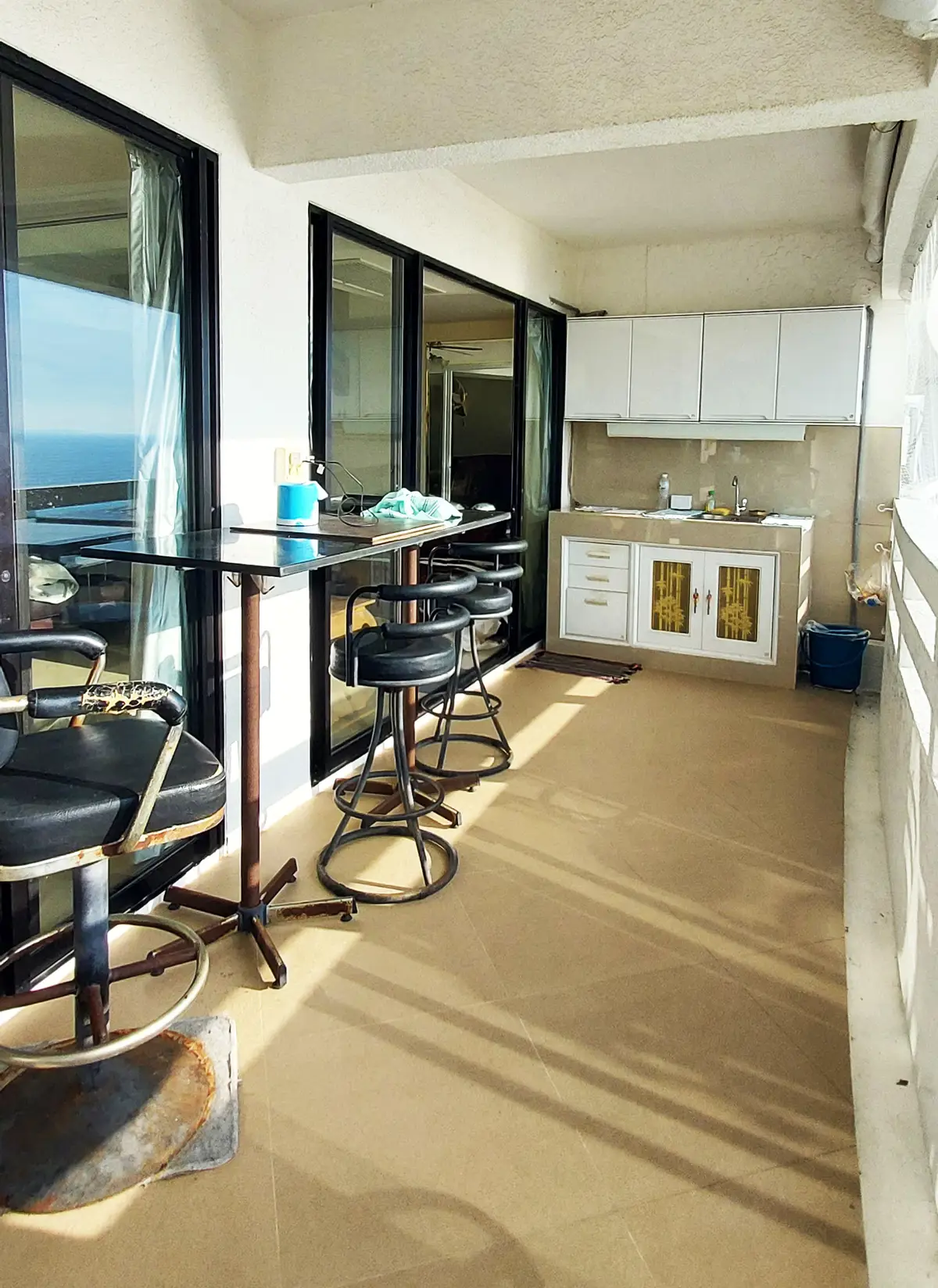 The residential property has a living area of 120 square meters and has 1 bedroom, 2 bathrooms, a living room and 2 kitchens. A larger kitchen and a smaller one at the end of the very large balcony.