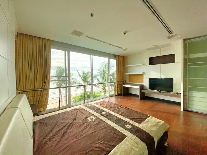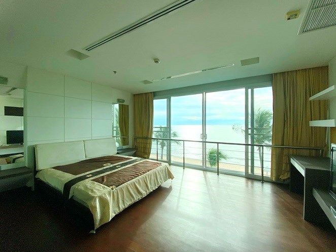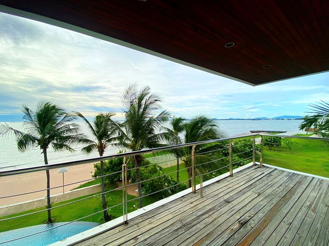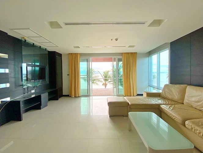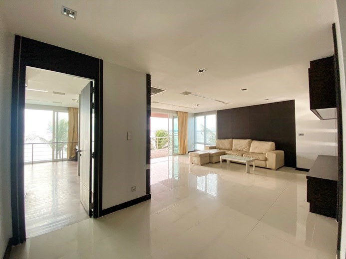 Sliding doors opening to a large balcony overlooking the over-sized communal swimming pool and the ocean