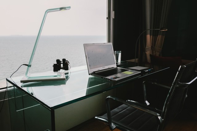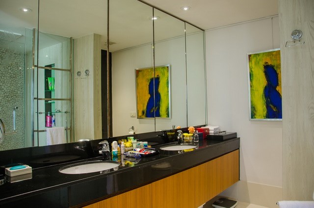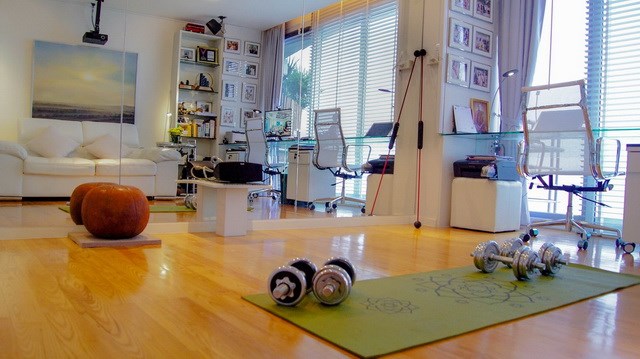 The third bedroom suite is presently being used as a multi-functional room for fitness, yoga and office; equipped with full mirrored wall, sofa, office area with amazing ocean views, and TV Projector.