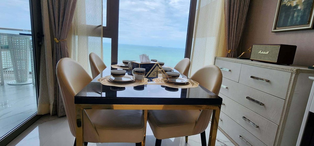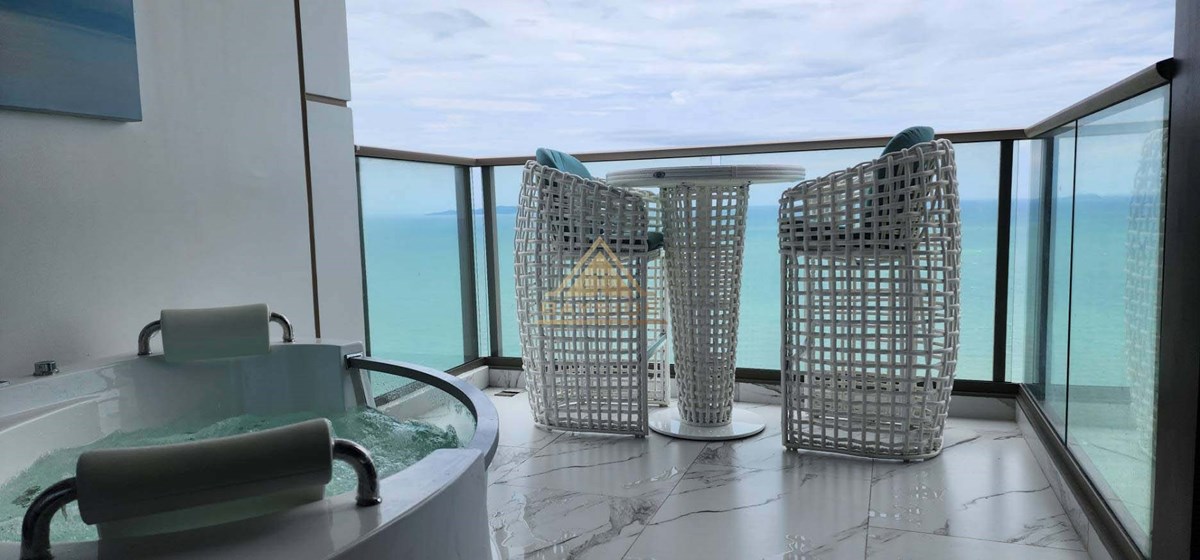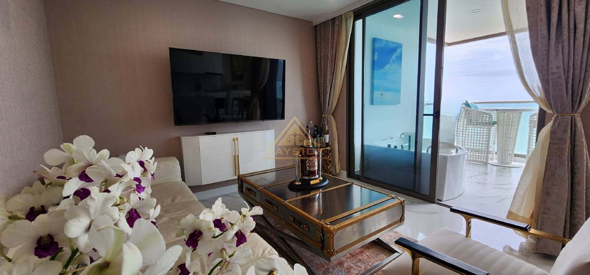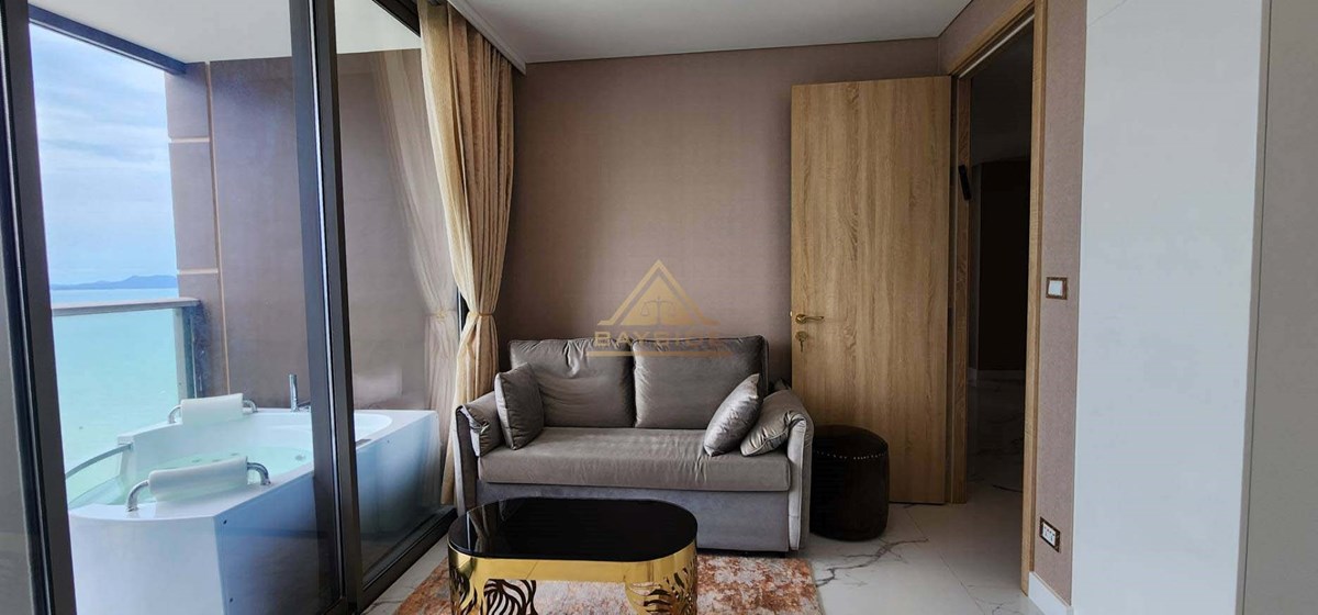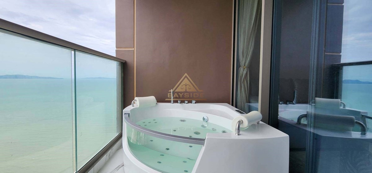Beachfront Condo in Jomtien and Luxury style, fitted furniture, washing machine, Air conditions, Flat Screen TV, Dining table, Fully Kitchen ( Electric Hob,Refrigerator/Freezer, Microwave,Complete Kitchen Tool Set, etc.), Living room with couch!! and Balcony (Beach View) and Jacuzzi x2, Usable area 111 Sqm. !!