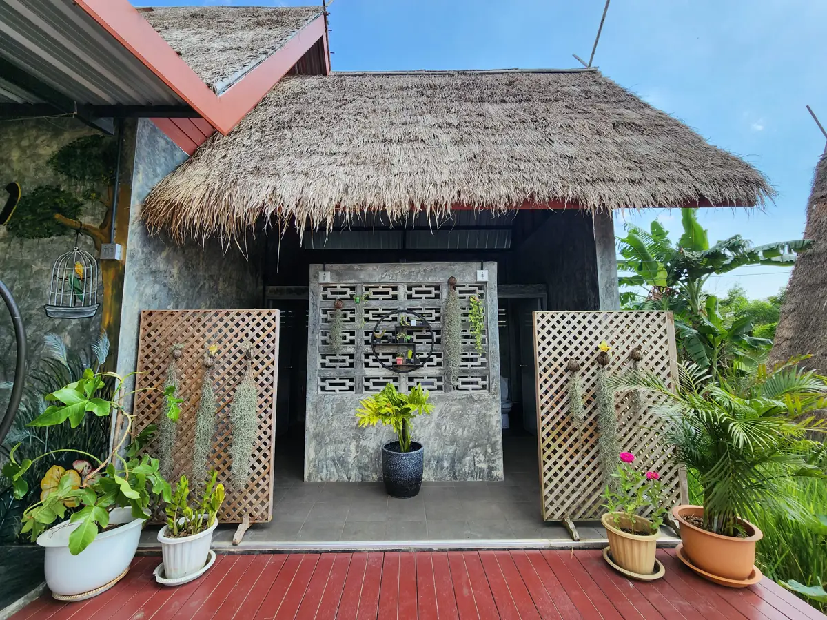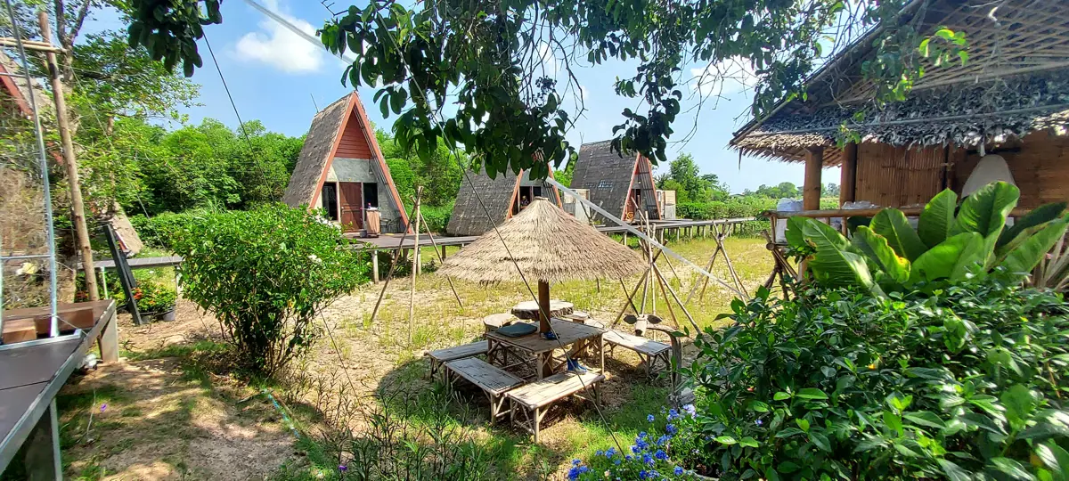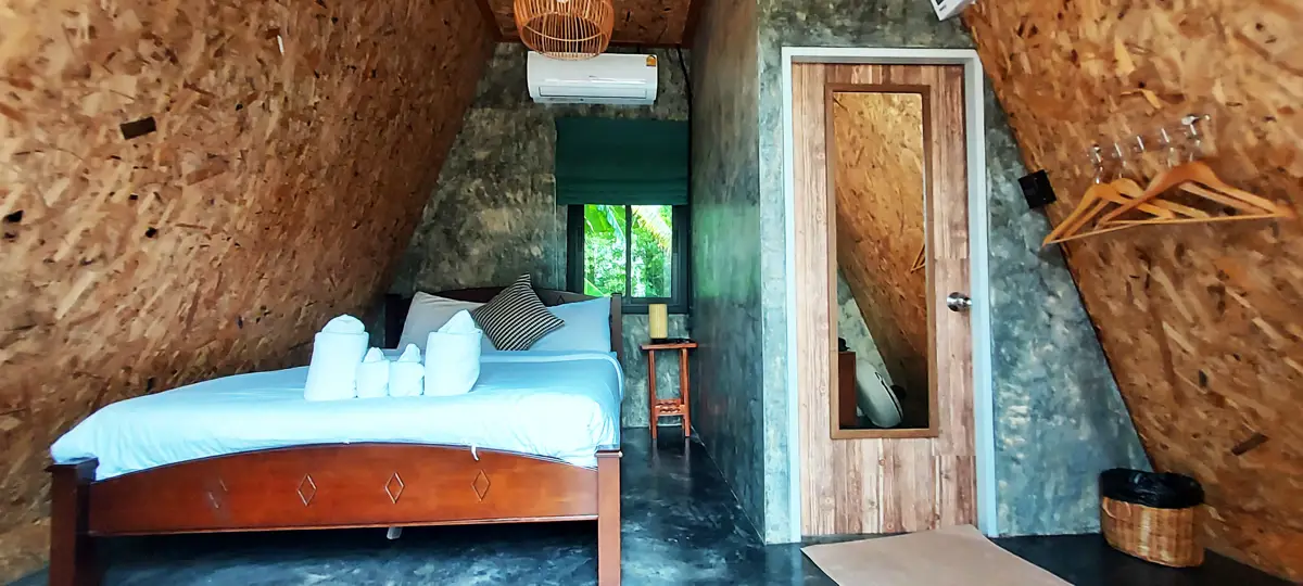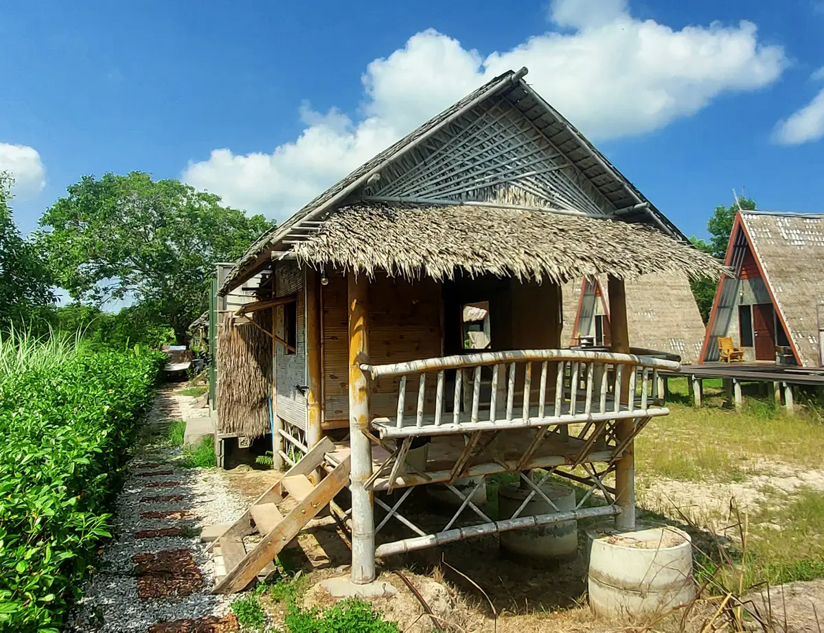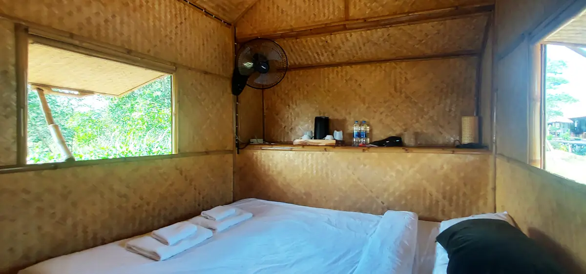 The resort currently has 7 bungalows with a double bed each, of which 4 have a bedroom with a bathroom and which have AC. The other 3 bungalows are bamboo huts with a fan and a shared bathroom.