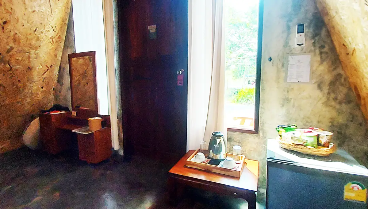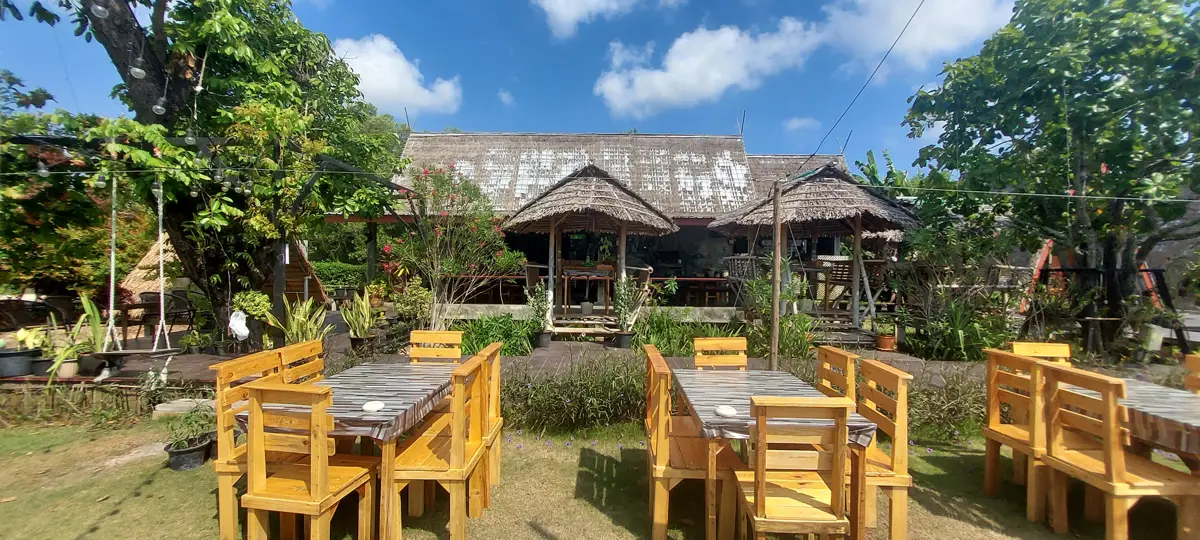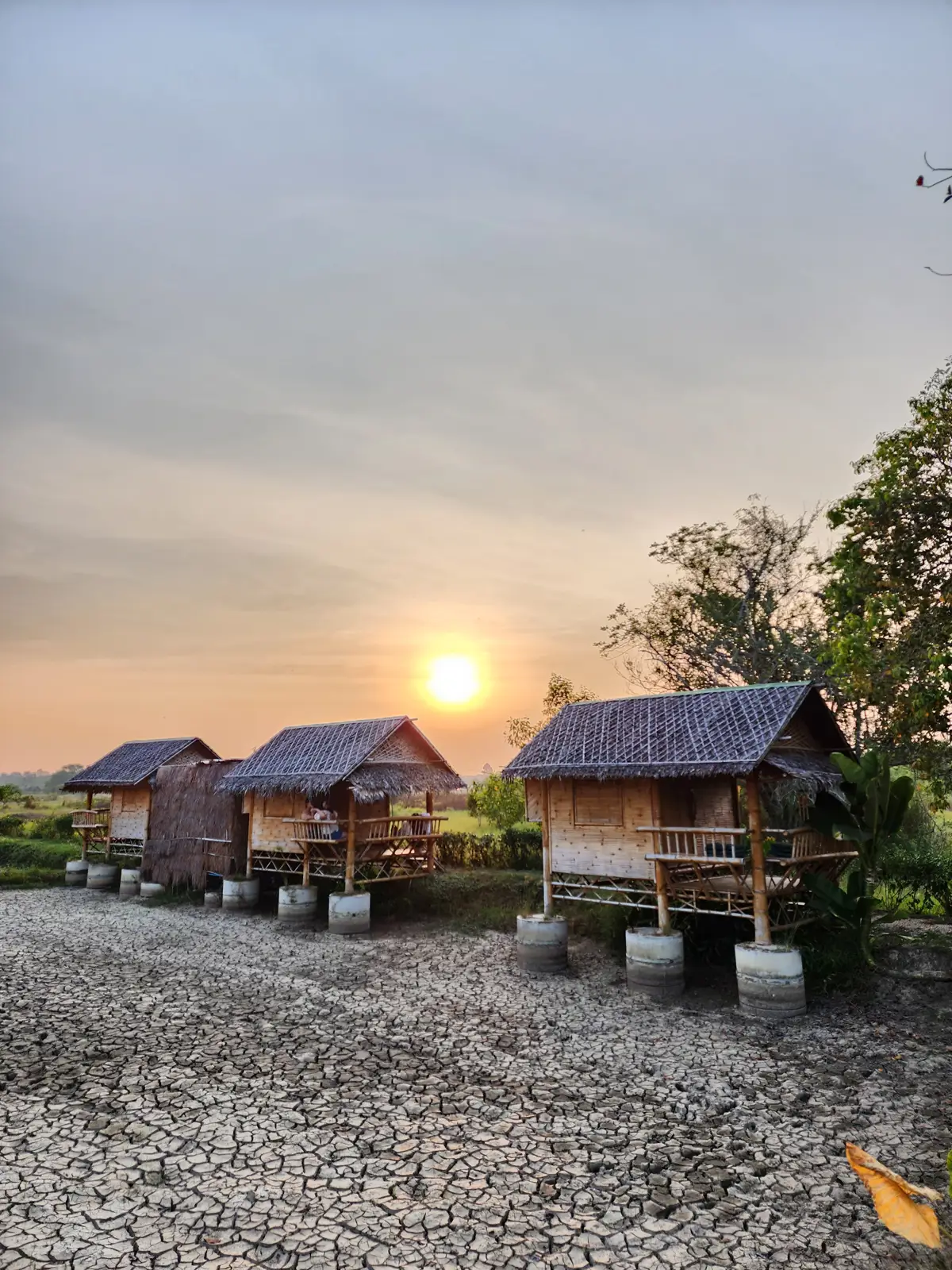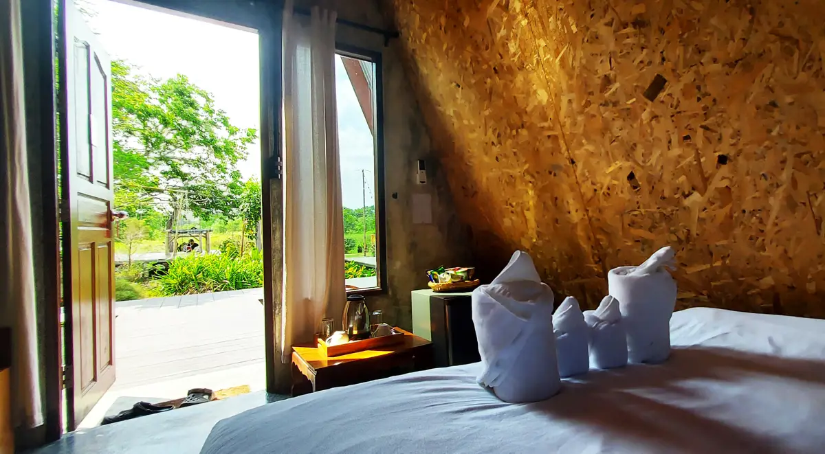 The resort currently has 7 bungalows with a double bed each, of which 4 have a bedroom with a bathroom and which have AC. The other 3 bungalows are bamboo huts with a fan and a shared bathroom.