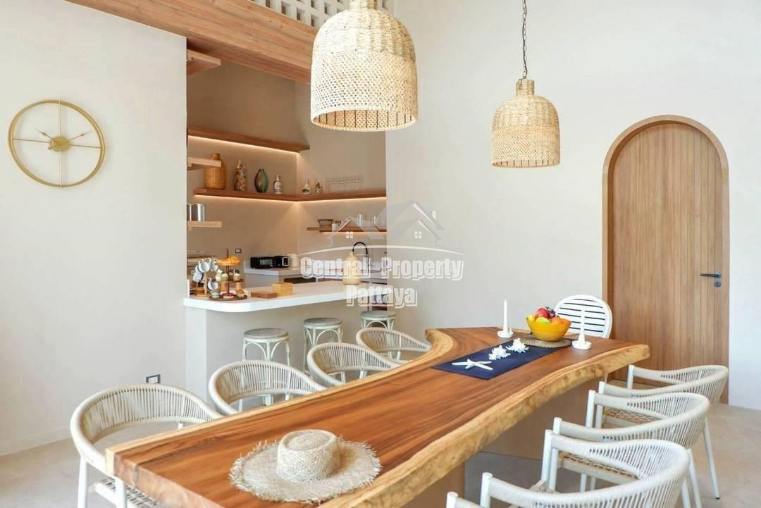 Inside, the high-ceilinged open-plan living and dining area is bathed in natural light, with woven pendant lighting and a stunning wood dining table that adds a rustic charm. The fully equipped kitchen, with stylish built-in shelves and warm accent lighting, is ideal for culinary enthusiasts.