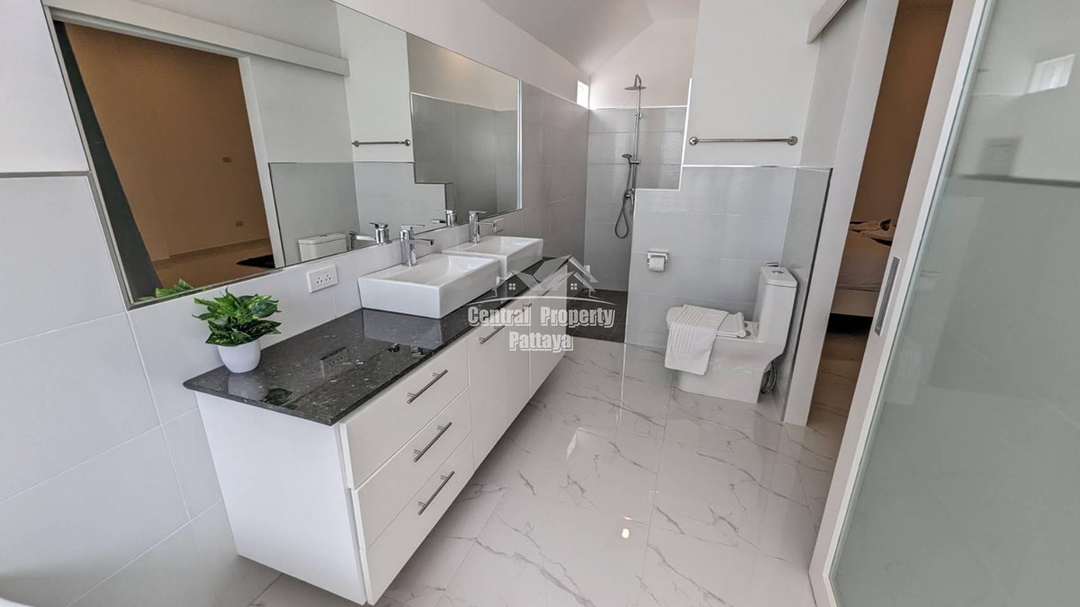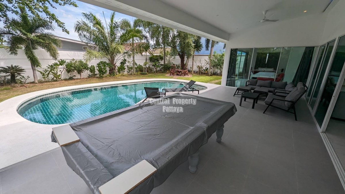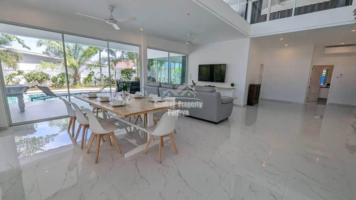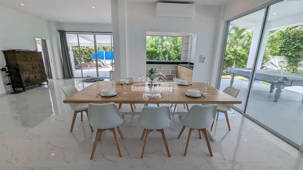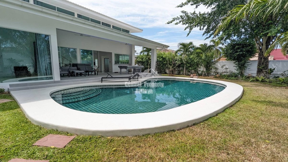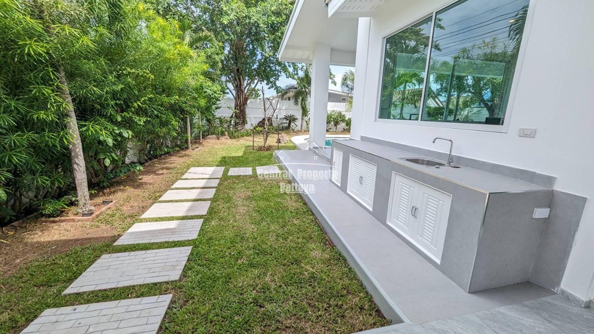 An exceptional 6 bedroom, 8 bathroom house with private pool for sale in company name near Mabprachan Lake, East Pattaya. This home has been beautifully constructed to a very high standard in a contemporary architectural style and is fully furnished, including fitted wardrobes and an impressive, fully fitted European family kitchen. The bathrooms are modern and spacious and there is plenty of storage throughout the property. As well as the large, signature private pool with sundeck, this house also has an al-fresco living area which is perfect for entertaining, as well as private parking and an extensive garden.