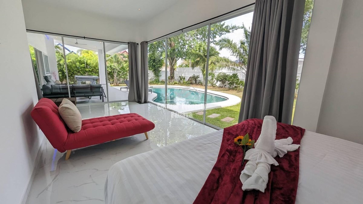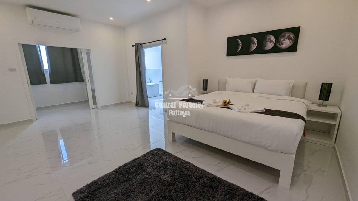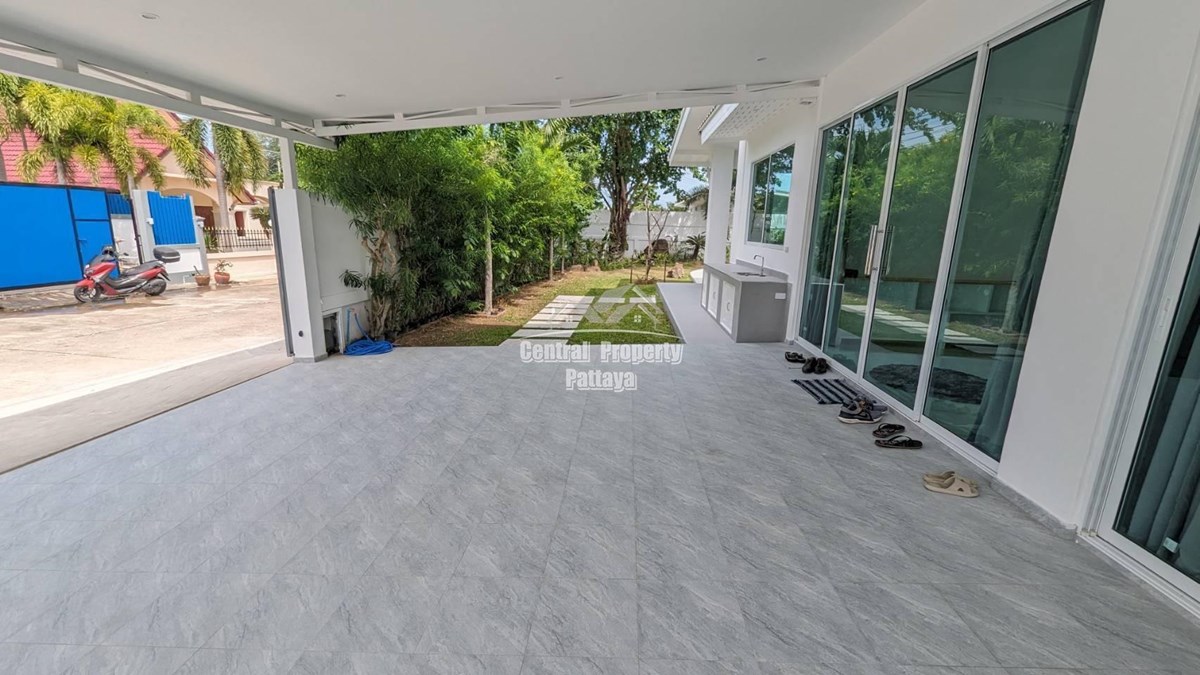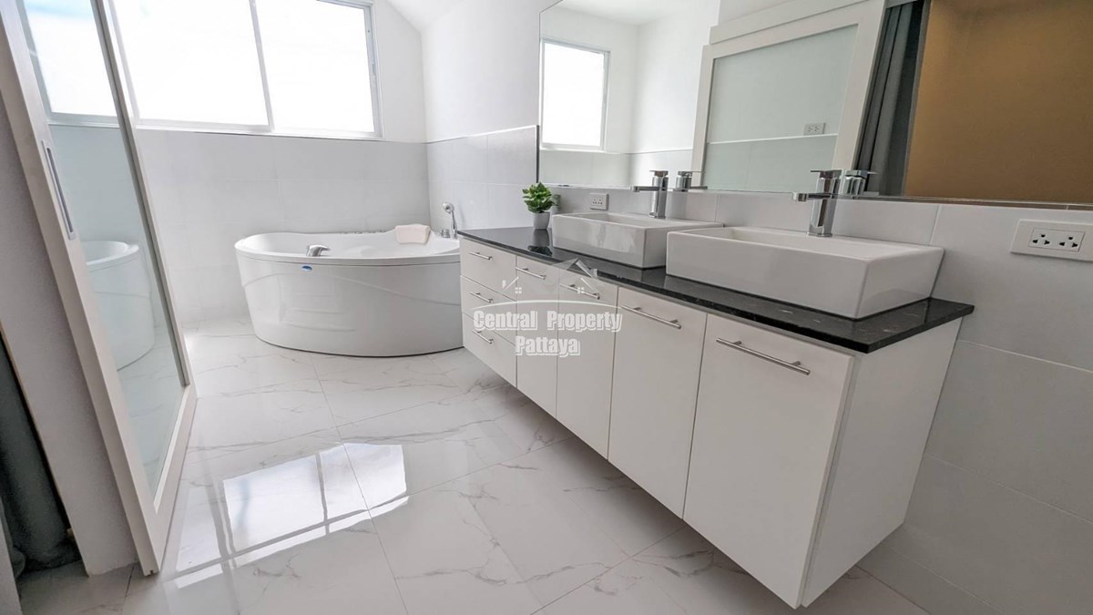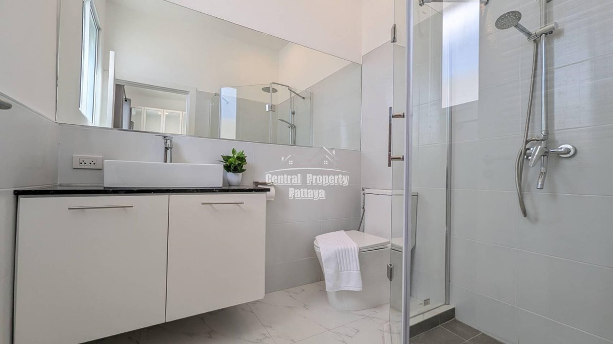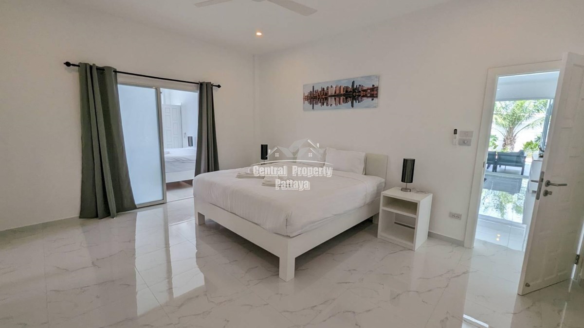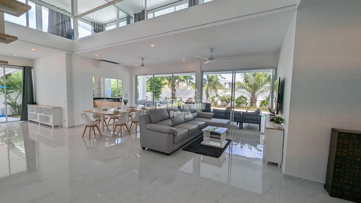 An exceptional 6 bedroom, 8 bathroom house with private pool for sale in company name near Mabprachan Lake, East Pattaya. This home has been beautifully constructed to a very high standard in a contemporary architectural style and is fully furnished, including fitted wardrobes and an impressive, fully fitted European family kitchen. The bathrooms are modern and spacious and there is plenty of storage throughout the property. As well as the large, signature private pool with sundeck, this house also has an al-fresco living area which is perfect for entertaining, as well as private parking and an extensive garden.