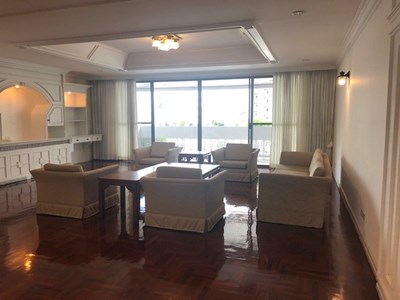 This is a spacious 3 bedroom, 4 bathroom apartment for rent at Govind Tower on Sukhumvit 19. The property measures 260 sqm, comes furnished and has 2 large master bedrooms with balconies, a bedroom with double beds, large living and dining area with balconies at both ends (North and South), a separate fully equipped kitchen and a maid's quarters and storeroom.