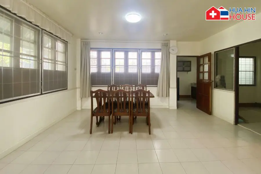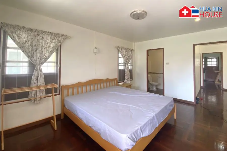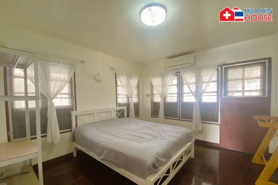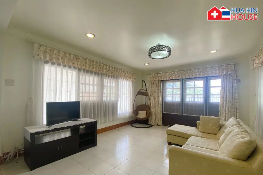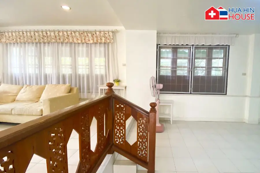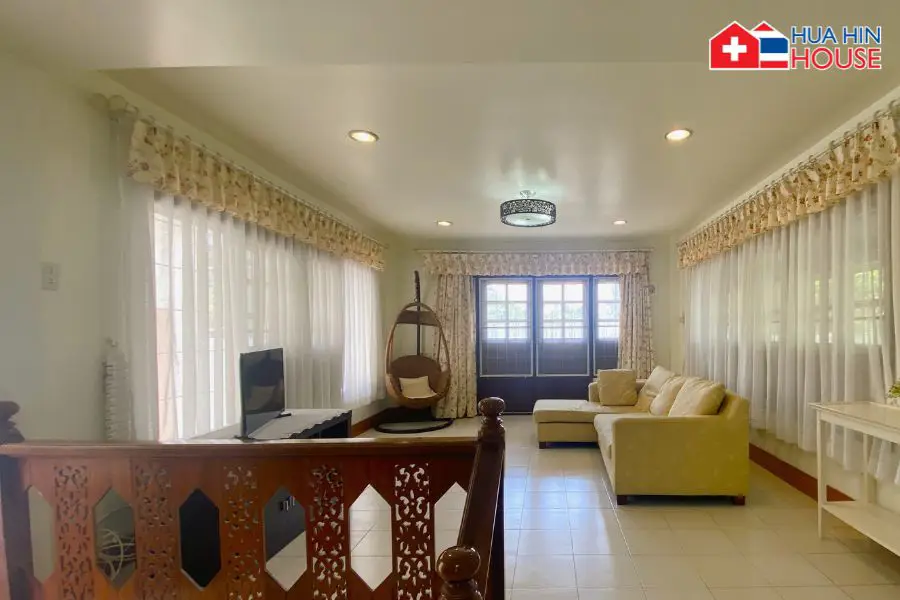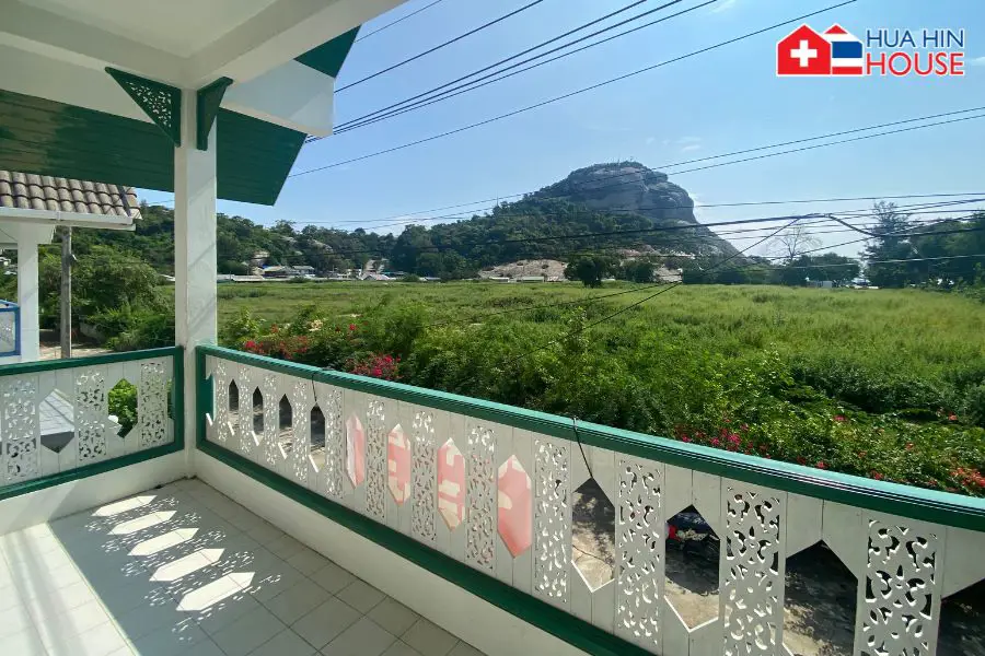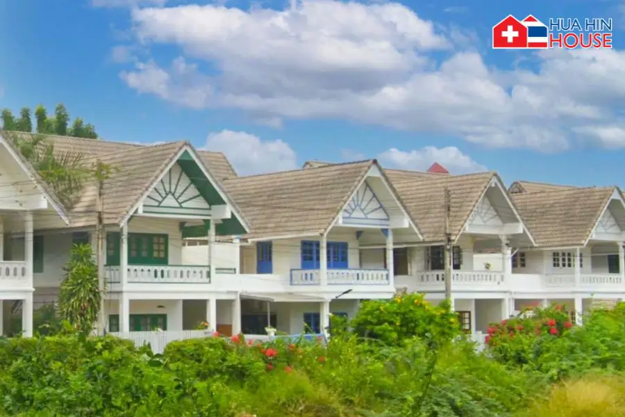 Traditional two-story houses with gable roofs, vibrant window accents, and balconies. The houses are set a mountain view in front.