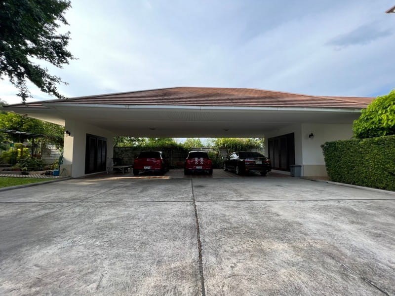 The driveway alone to this spacious villa near Hua Hin is an experience. You reach the villa via a private inner road, which is surrounded by flowering and evergreen trees. In the evening hours, solar lamps provide a friendly atmosphere. Under a covered carport, there is parking for up to five vehicles.