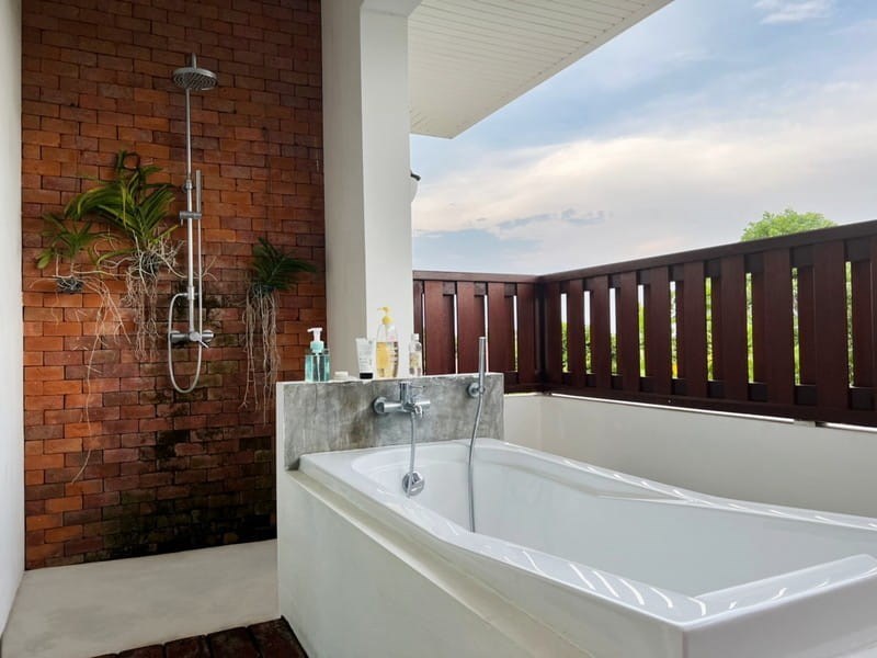 The interior design inspires with the use of high-quality materials and a combination of stone in different colours. As well as with furnishings made of fine hardwoods. The rooms are spread over two floors. A large living and dining room dominate the ground floor and offer a lot of space and freedom of movement. The kitchen is fully equipped with all technical appliances. From all sides of the villa in Hua Hin, there is a fantastic view of the garden with pool and the flowering landscape.