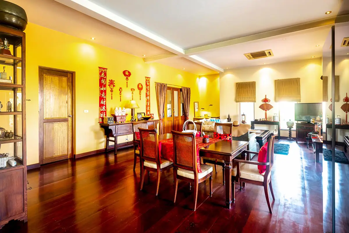 - Dining Area: A majestic antique wooden dining table set for six, perfectly complemented by the rich, real wood flooring.