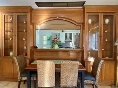 Dining area with dining table, 4 chairs and built-in cabinet.
