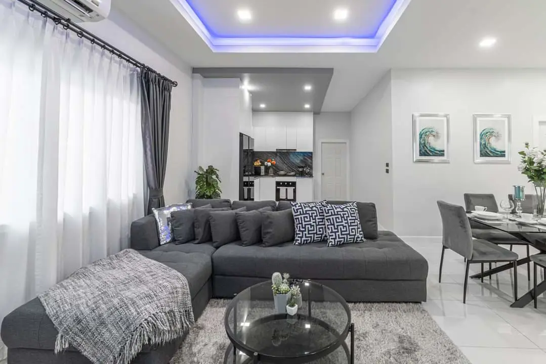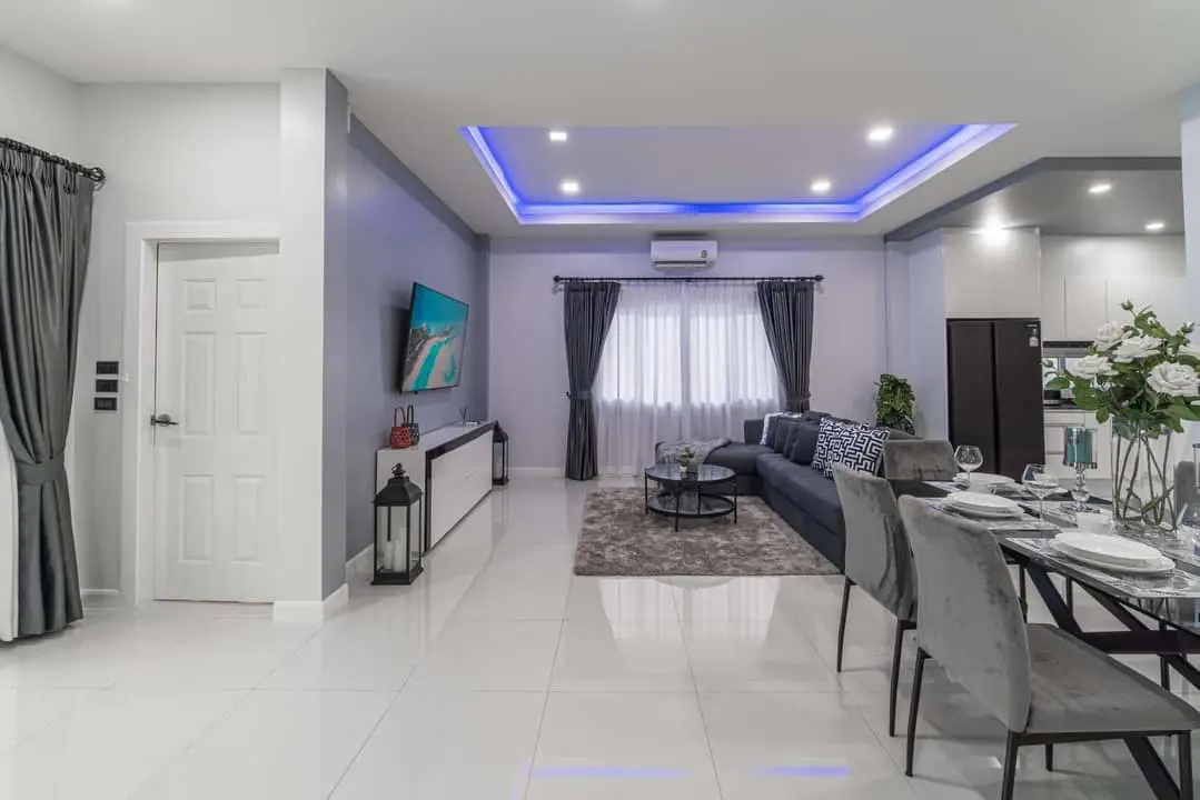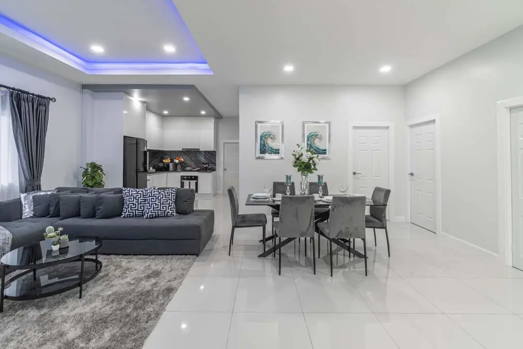 Step into the American-style large open-plan living area, seamlessly connected to the dining space and a fully equipped kitchen.